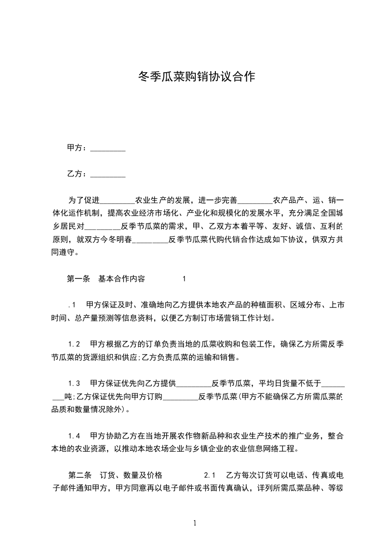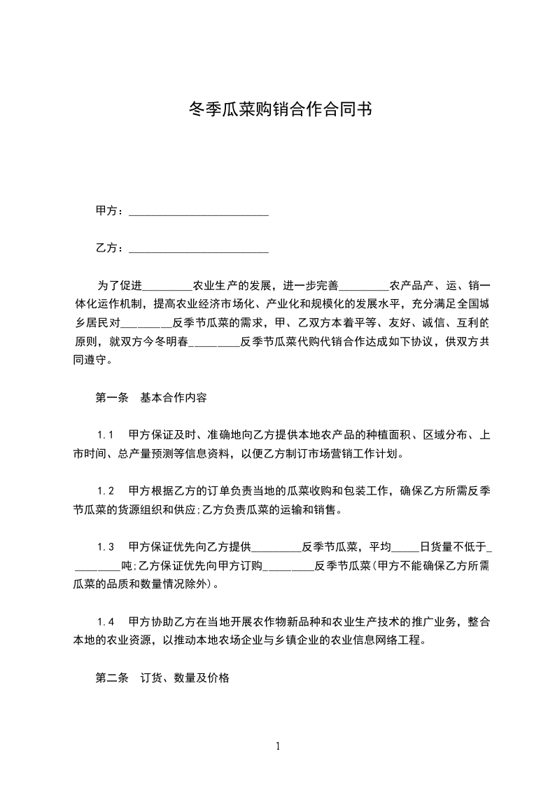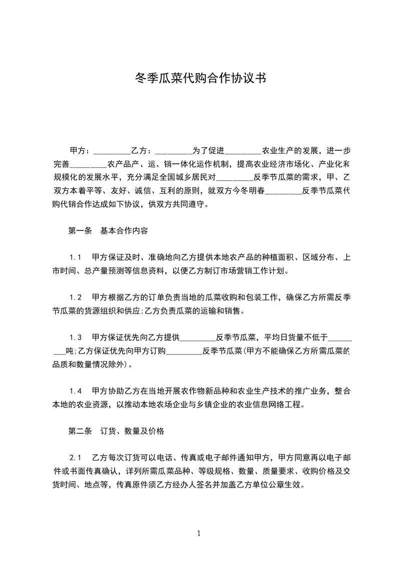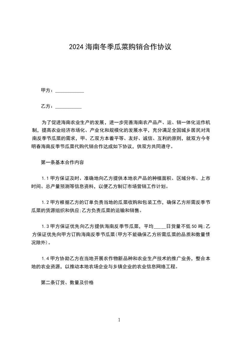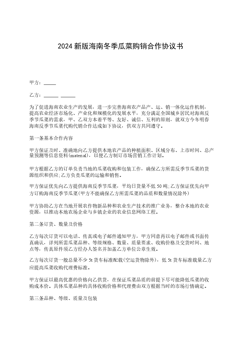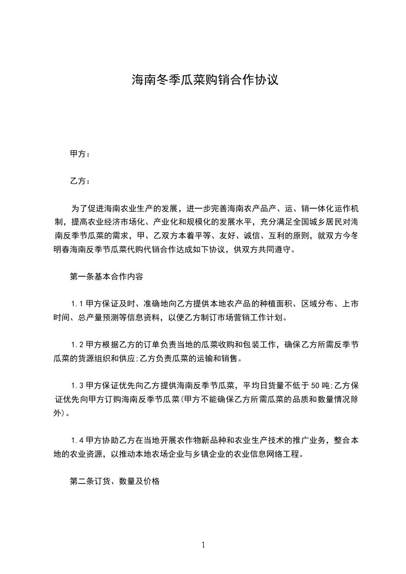 为了促进海南农业生产的发展,进一步完善海南农产品产、运、销一体化运作机制,提高农业经济市场化、产业化和规模化的发展水平,充分满足全国城乡居民对海南反季节瓜菜的需求,甲、乙双方本着平等、友好、诚信、互利的原则,就双方今冬明春海南反季节瓜菜代购代销合作达成如下协议,供双方共同遵守。