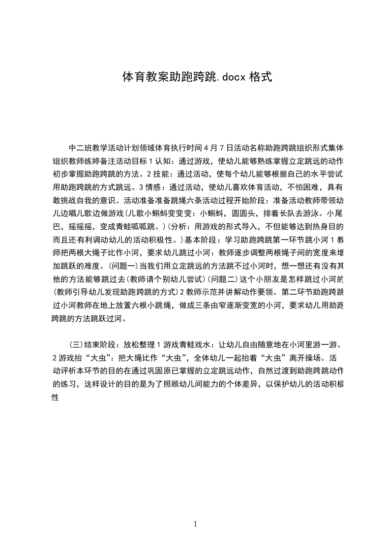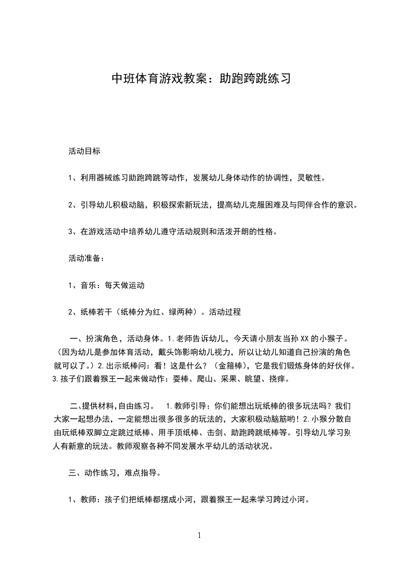1、利用器械练习助跑跨跳等动作,发展幼儿身体动作的协调性,灵敏性。