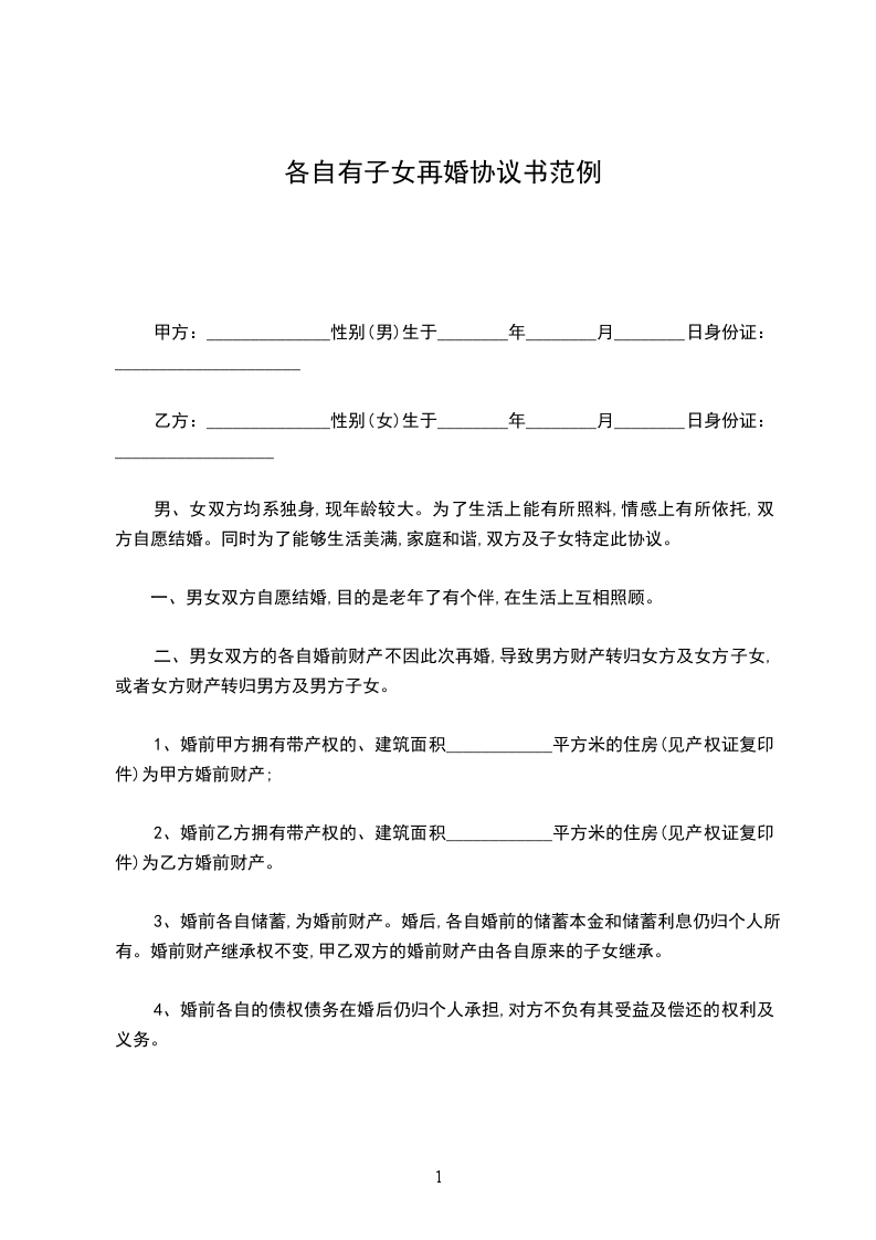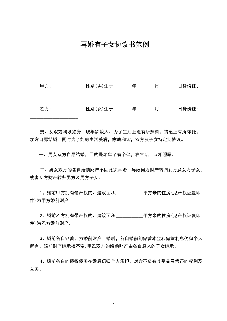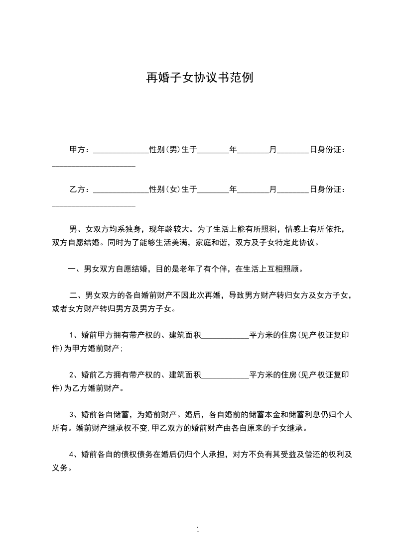 男、女双方均系独身,现年龄较大。为了生活上能有所照料,情感上有所依托,双方自愿结婚。同时为了能够生活美满,家庭和谐,双方及子女特定此协议。