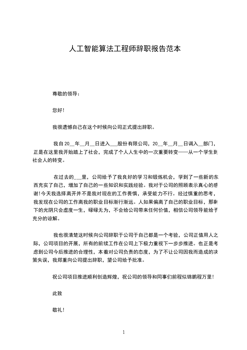 在过去的___里,公司给予了我良好的学习和锻炼机会,学到了一些新的东西充实了自己,增加了自己的一些知识和实践经验。我对于公司的照顾表示真心的感谢!今天我选择离开并不是我对现在的工作畏惧,承受能力不行。经过慎重的思考,我发现在公司的工作离我的职业目标渐行渐远。人如果偏离了自己的职业目标,那剩下的光阴只会虚度一生,碌碌无为,不会给公司带来任何价值,相信公司领导能给予充分的谅解。