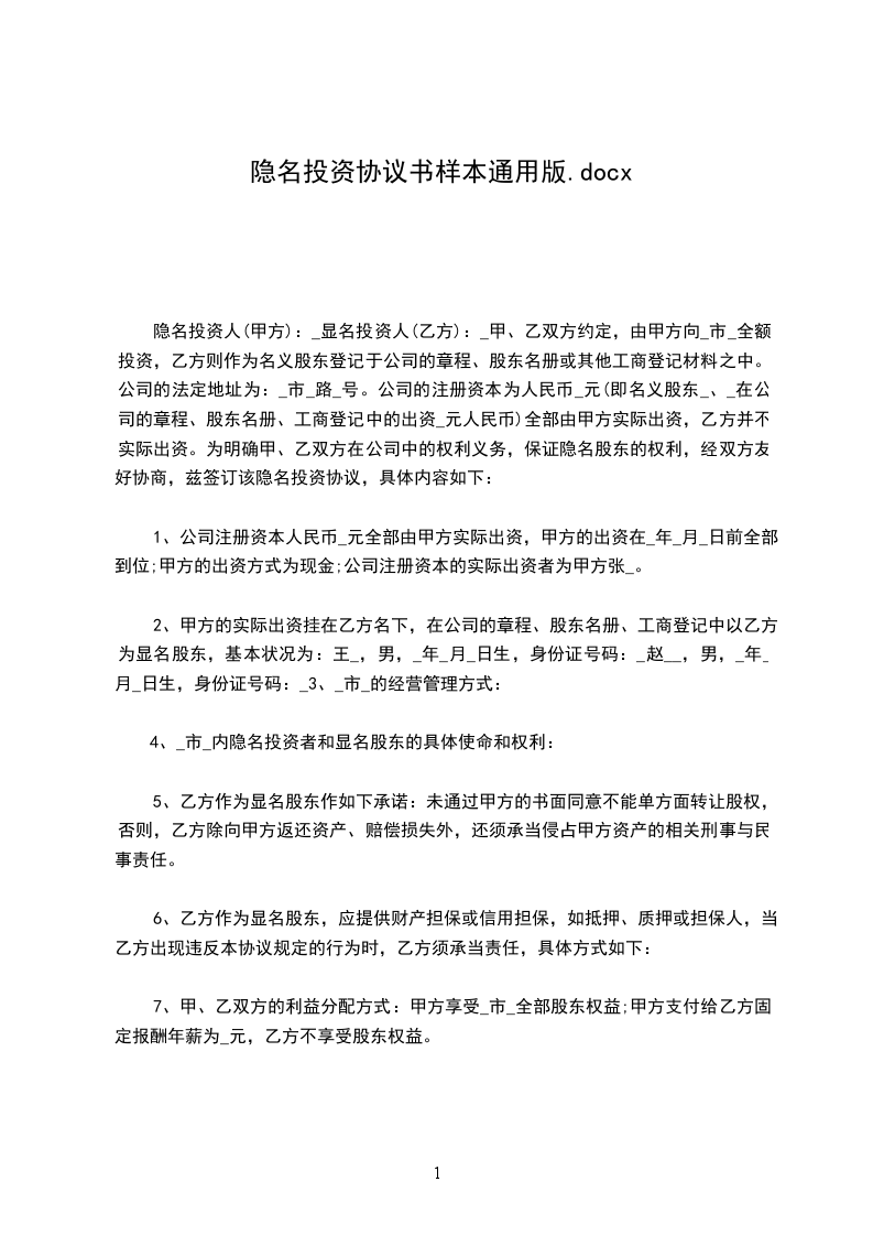 隐名投资人(甲方):_显名投资人(乙方):_甲、乙双方约定,由甲方向_市_全额投资,乙方则作为名义股东登记于公司的章程、股东名册或其他工商登记材料之中。公司的法定地址为:_市_路_号。公司的注册资本为人民币_元(即名义股东_、_在公司的章程、股东名册、工商登记中的出资_元人民币)全部由甲方实际出资,乙方并不实际出资。为明确甲、乙双方在公司中的权利义务,保证隐名股东的权利,经双方友好协商,兹签订该隐名投资协议,具体内容如下: