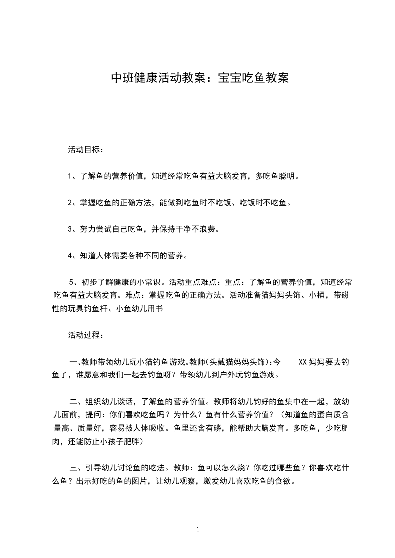 5、初步了解健康的小常识。活动重点难点:重点:了解鱼的营养价值,知道经常吃鱼有益大脑发育。难点:掌握吃鱼的正确方法。活动准备猫妈妈头饰、小桶,带磁性的玩具钓鱼杆、小鱼幼儿用书
