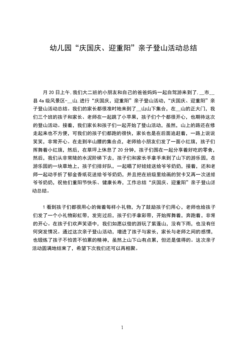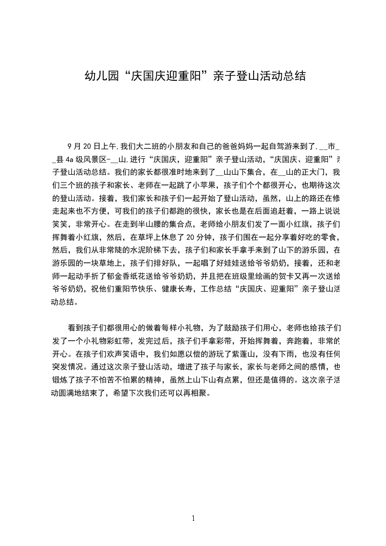 月20日上午,我们大二班的小朋友和自己的爸爸妈妈一起自驾游来到了,__市__县4a级风景区-__山,进行“庆国庆,迎重阳”亲子登山活动,“庆国庆、迎重阳”亲子登山活动总结。我们的家长都很准时地来到了__山山下集合,在__山的正大门,我们三个班的孩子和家长、老师在一起跳了小苹果,孩子们个个都很开心,也期待这次的登山活动。接着,我们家长和孩子们一起开始了登山活动,虽然,山上的路还在修,走起来也不方便,可我们的孩子们都跑的很快,家长也是在后面追赶着,一路上说说笑笑,非常开心。在走到半山腰的集合点,老师给小朋友们发了一面小红旗,孩子们挥舞着小红旗,然后,在草坪上休息了20分钟,孩子们围在一起分享着好吃的零食,然后,我们从非常陡的水泥阶梯下去,孩子们和家长手拿手来到了山下的游乐园,在游乐园的一块草地上,孩子们排好队,一起唱了好娃娃送给爷爷奶奶,接着,还和老师一起动手折了郁金香纸花送给爷爷奶奶,并且把在班级里绘画的贺卡又再一次送给爷爷奶奶,祝他们重阳节快乐、健康长寿,工作总结“庆国庆、迎重阳”亲子登山活动总结。
