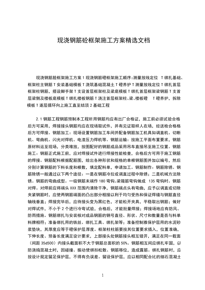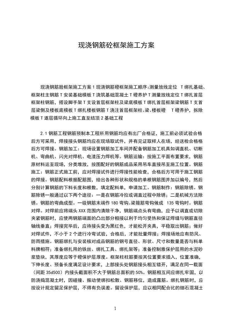 2.1钢筋工程钢筋预制本工程所用钢筋均应有出厂合格证,施工前必须试验合格后方可采用,焊接接头钢筋均应在现场取试件,并有见证取样人在场,经送检合格格后方可焊接。钢筋加工:现场设置钢筋加工车间并配备钢筋加工机具如调直机、切断机、弯曲机、闪光对焊机、电渣压力焊机等。钢筋运输:按施工平面布置要求,钢筋原材料运至现场,分类堆放,按图配好的钢筋成品采用吊车直接吊至施工位置。钢筋施工:钢筋正式施工前,应对焊接试件进行焊接性能检查,合格后方可用于施工钢筋的焊接。钢筋配料根据配筋图,绘出各种形状和规格的单根钢筋图并加以编号,然后分别计算钢筋的下料长度和根数,填定配料单,申请加工。钢筋制作:钢筋除锈。钢筋除锈一般通过以下两个途径:一是在钢筋冷拉或调直过程中除锈;二是机械方法除锈。钢筋的弯曲成型。一级钢筋末端作180弯钩。梁箍筋弯钩做成135弯钩时。钢筋对焊。对焊前应将端头XXX范围内清除干净,钢筋端点头有弯曲,应予以调直或切除;夹紧钢筋时,应使两钢筋端面的凸出部分相接以利于均匀受热和保证焊缝与钢筋直径轴线垂直;焊接完毕后,应待接头变为黑红色,才能松开夹具,平稳取出钢筋;做好对焊试件,不小于2个进行冷弯试验,合格后,才能批量焊接;焊接场地应有防风、防雨措施。钢筋绑扎与安装核对成品钢筋的钢号直径、形状、尺寸和数量是否与料单、料牌相符;准备绑扎用的铁丝、绑扎工具、绑扎架等;准备控制雅保护层用的水泥砂浆垫块,其厚度应等于磴保护层厚度。框架柱柱筋要按其位置要求插入,位置准确,下伸长度、预备长度满足设计要求,上部接头处钢筋接头相互错开,满足在同一载面(间距35d500)内接头截面积不大于钢筋总面积的50%。钢筋相互间应绑扎牢固,以防浇捣混凝土时,因碰撞、振动使绑扣松散、钢筋移位,造成露筋。绑扎钢筋时,应按设计规定留足保护层,不得有负误差。留设保护层,应以相同配合比的细石混凝土或水泥砂浆制成垫块,将钢筋垫起,严禁以钢筋垫钢筋,或将钢筋用铁钉、铅丝直接固定在模板上。