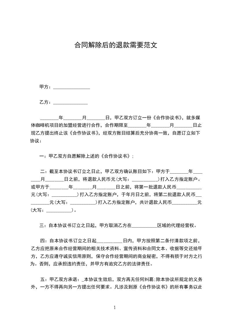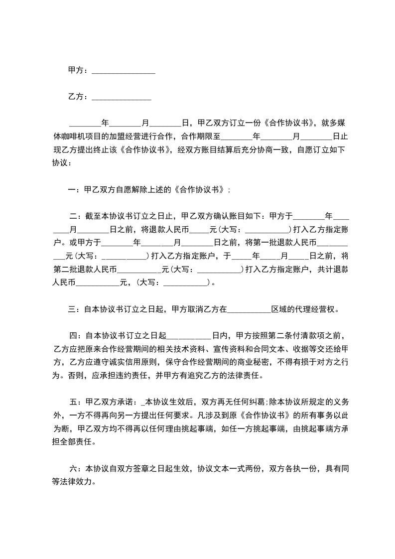 ________年________月________日,甲乙双方订立一份《合作协议书》,就多媒体咖啡机项目的加盟经营进行合作,合作期限至________年________月________日止,现乙方提出终止该《合作协议书》,经双方账目结算后充分协商一致,自愿订立如下协议: