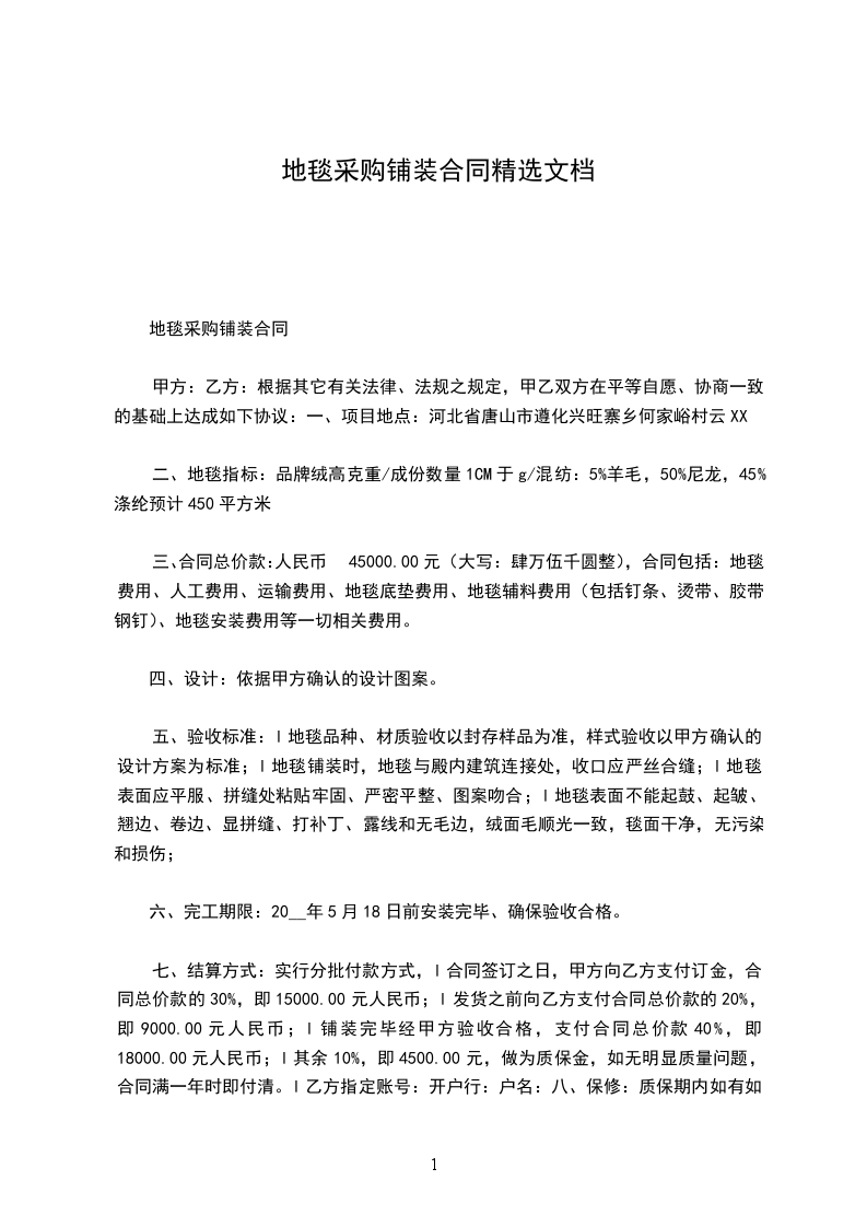 七、结算方式:实行分批付款方式,l合同签订之日,甲方向乙方支付订金,合同总价款的30%,即15000.00元人民币;l发货之前向乙方支付合同总价款的20%,即9000.00元人民币;l铺装完毕经甲方验收合格,支付合同总价款40%,即18000.00元人民币;l其余10%,即4500.00元,做为质保金,如无明显质量问题,合同满一年时即付清。l乙方指定账号:开户行:户名:八、保修:质保期内如有如下状况:缩水、起鼓、起皱、翘边、卷边、显拼缝、露线和无毛边等问题,乙方于3日内上门维修或更换,如达不到效果,甲方有权请人维修或更换,费用由乙方承担。