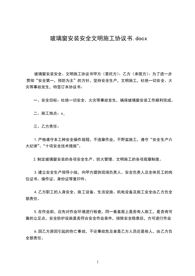 玻璃窗安装安全、文明施工协议书甲方(委托方):乙方(承揽方):为了进一步贯彻“安全第一,预防为主”的方针,坚持安全生产,文明施工,杜绝一切安全、火灾等事故发生,特签订本协议书: