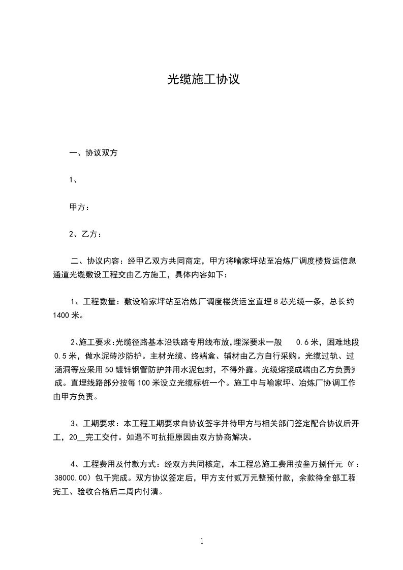 二、协议内容:经甲乙双方共同商定,甲方将喻家坪站至冶炼厂调度楼货运信息通道光缆敷设工程交由乙方施工,具体内容如下: