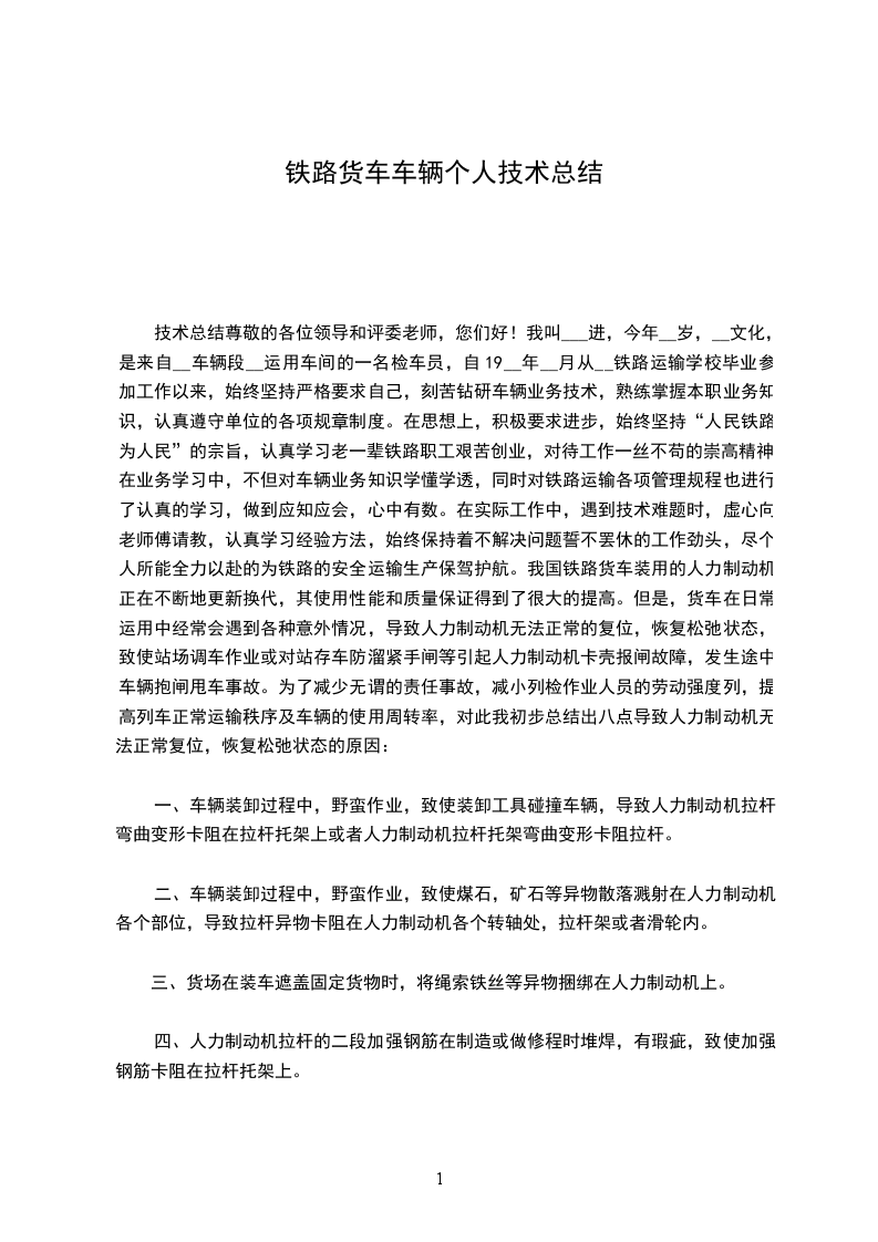 技术总结尊敬的各位领导和评委老师,您们好!我叫___进,今年__岁,__文化,是来自__车辆段__运用车间的一名检车员,自19__年__月从__铁路运输学校毕业参加工作以来,始终坚持严格要求自己,刻苦钻研车辆业务技术,熟练掌握本职业务知识,认真遵守单位的各项规章制度。在思想上,积极要求进步,始终坚持“人民铁路为人民”的宗旨,认真学习老一辈铁路职工艰苦创业,对待工作一丝不苟的崇高精神。在业务学习中,不但对车辆业务知识学懂学透,同时对铁路运输各项管理规程也进行了认真的学习,做到应知应会,心中有数。在实际工作中,遇到技术难题时,虚心向老师傅请教,认真学习经验方法,始终保持着不解决问题誓不罢休的工作劲头,尽个人所能全力以赴的为铁路的安全运输生产保驾护航。我国铁路货车装用的人力制动机正在不断地更新换代,其使用性能和质量保证得到了很大的提高。但是,货车在日常运用中经常会遇到各种意外情况,导致人力制动机无法正常的复位,恢复松弛状态,致使站场调车作业或对站存车防溜紧手闸等引起人力制动机卡壳报闸故障,发生途中车辆抱闸甩车事故。为了减少无谓的责任事故,减小列检作业人员的劳动强度列,提高列车正常运输秩序及车辆的使用周转率,对此我初步总结出八点导致人力制动机无法正常复位,恢复松弛状态的原因: