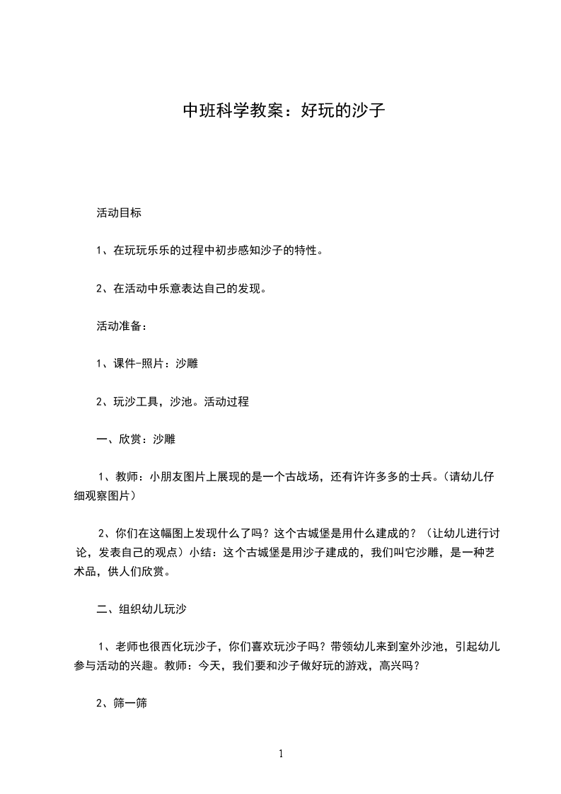 1、老师也很西化玩沙子,你们喜欢玩沙子吗?带领幼儿来到室外沙池,引起幼儿参与活动的兴趣。教师:今天,我们要和沙子做好玩的游戏,高兴吗?