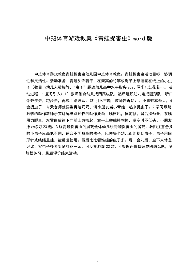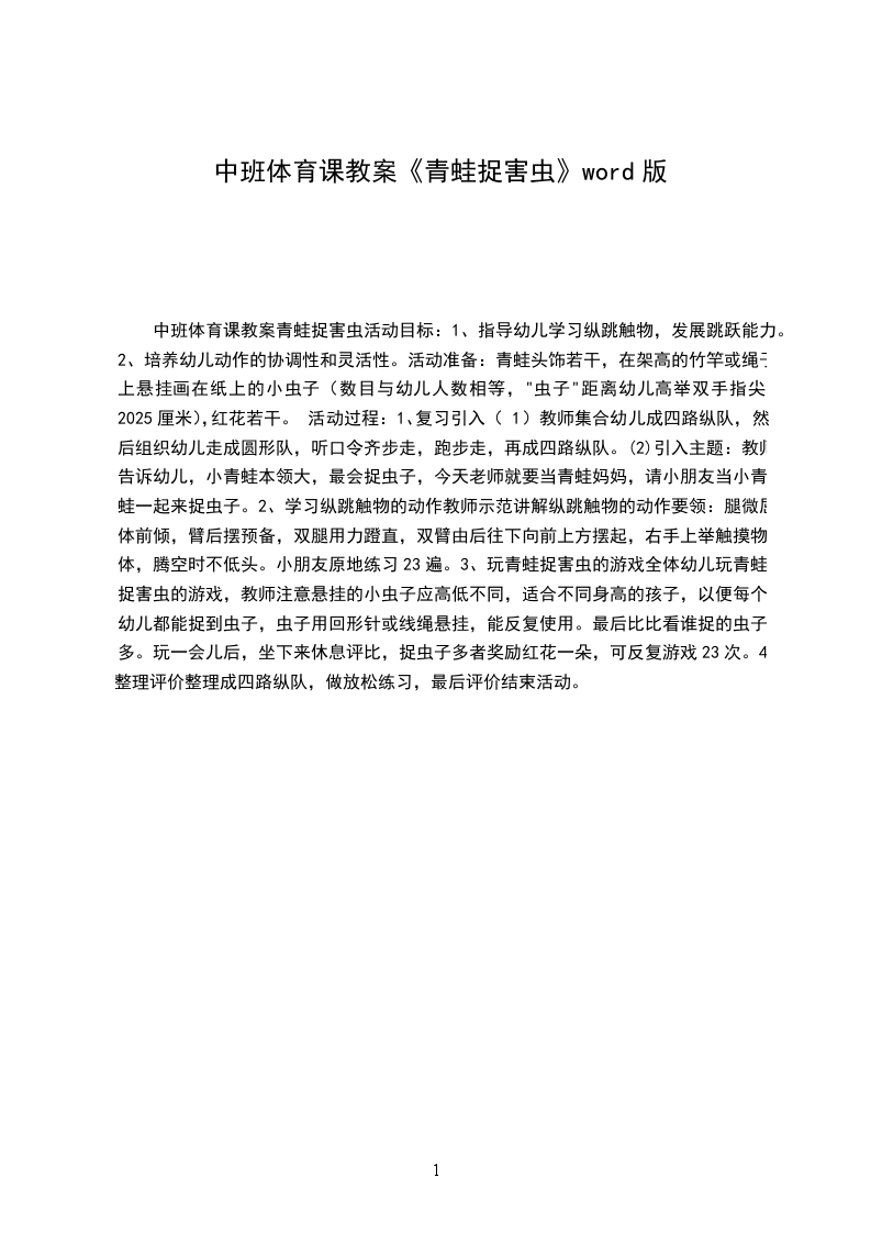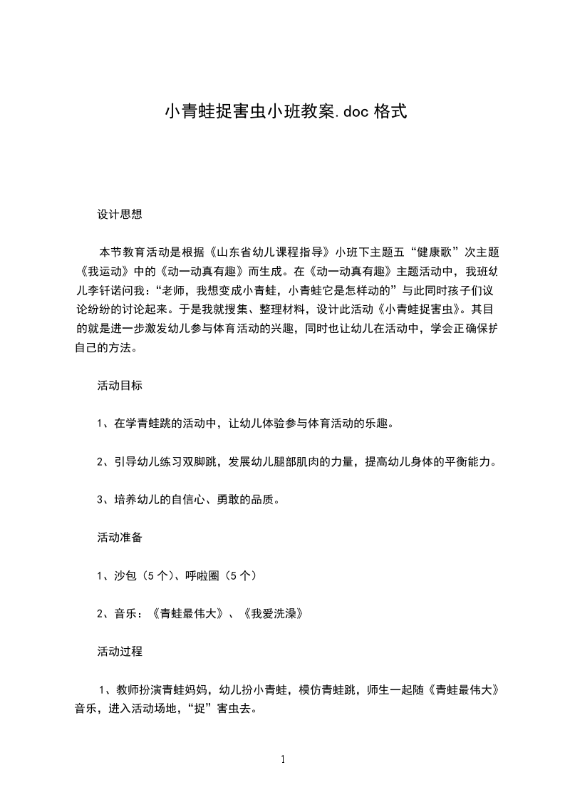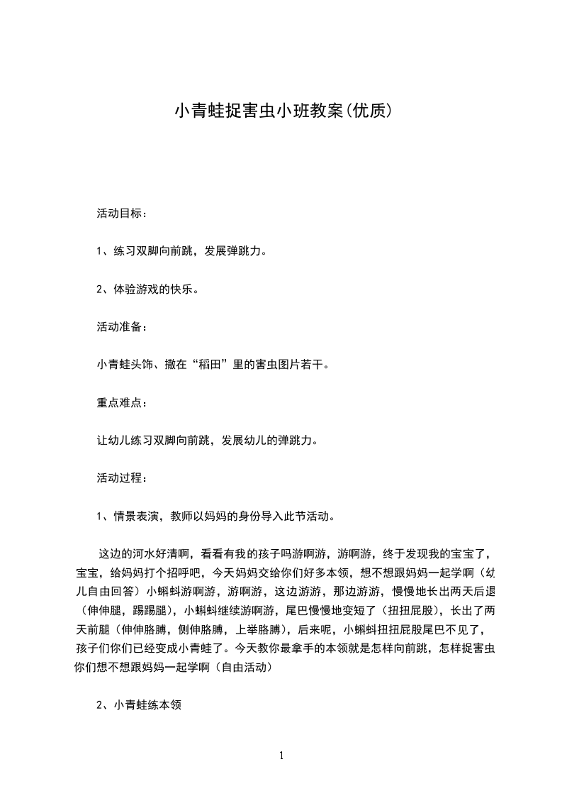 三、结束部分教师小结,做律动小青蛙离开教室。活动反思:基本过程我主要设计了小青蛙练本领,我先带领幼儿去荷叶上玩,先示范青蛙怎样跳,然后再进行动作讲解,边讲解的时候幼儿边做动作,然后幼儿自由练习。运动后请幼儿坐到荷叶上面休息,休息时告诉幼儿青蛙宝宝最大的本领是捉害虫,请幼儿学习捉害虫的方法,幼儿学的非常认真,积极性很高。