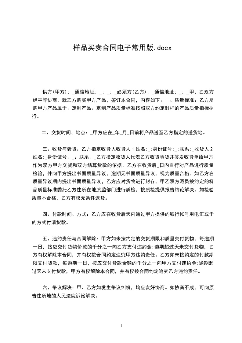 供方(甲方):_通信地址:_:_:_必须方(乙方):_通信地址:_:_甲、乙双方经平等协商,就乙方购买甲方产品,签订本合同,内容如下:一、质量标准:乙方所购甲方产品属于:定制产品。定制产品质量标准按照双方约定封样的产品质量指标执行。