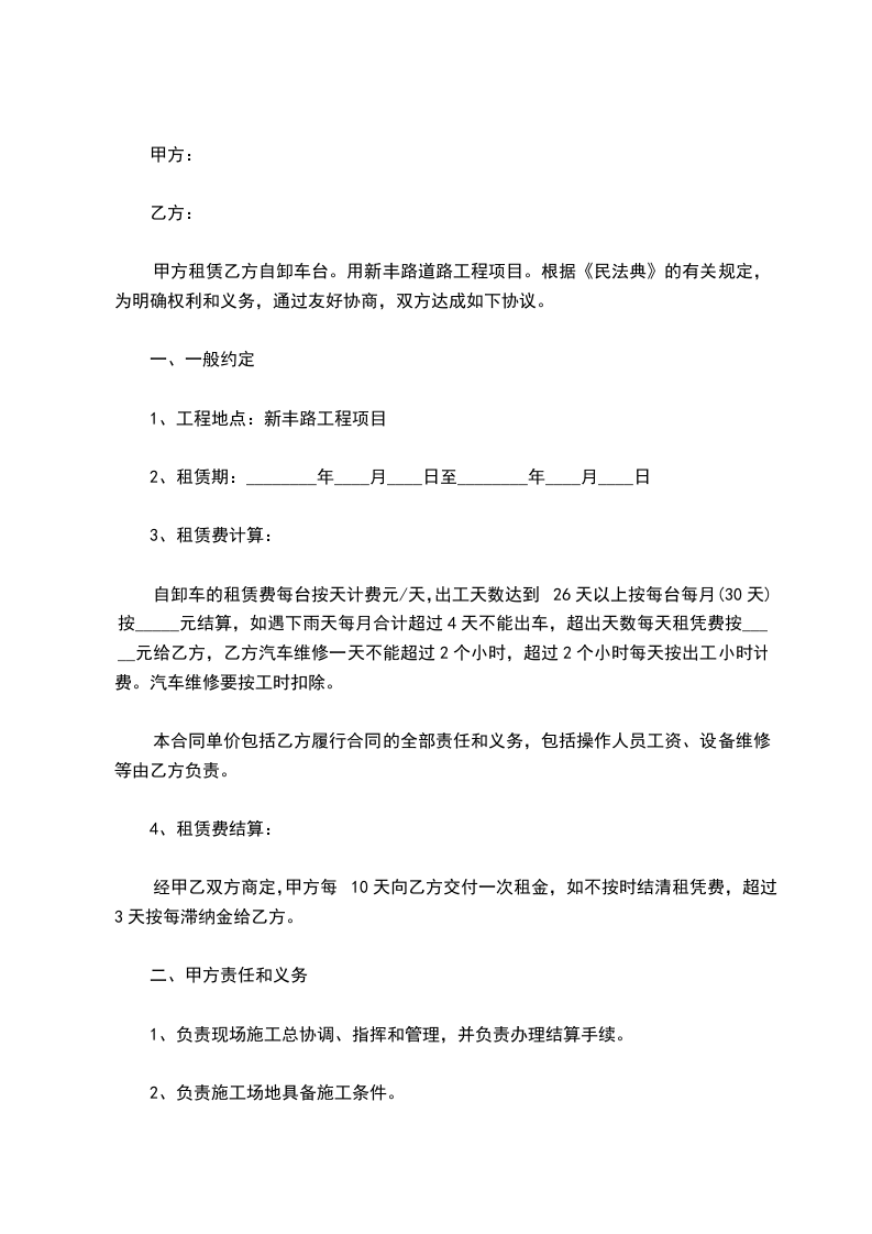 甲方租赁乙方自卸车台。用新丰路道路工程项目。根据《民法典》的有关规定,为明确权利和义务,通过友好协商,双方达成如下协议。