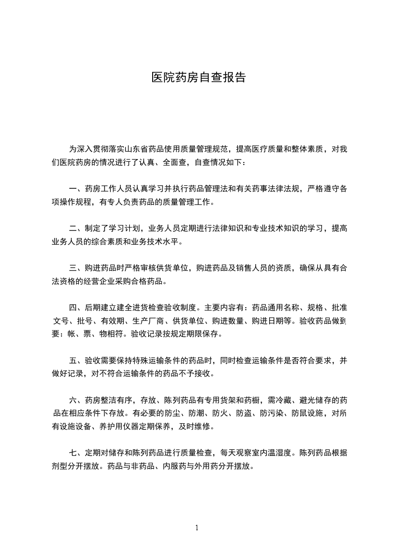 为深入贯彻落实山东省药品使用质量管理规范,提高医疗质量和整体素质,对我们医院药房的情况进行了认真、全面查,自查情况如下: