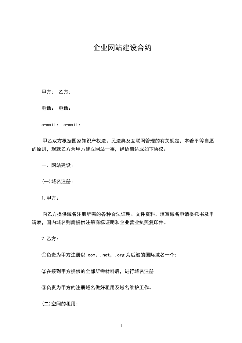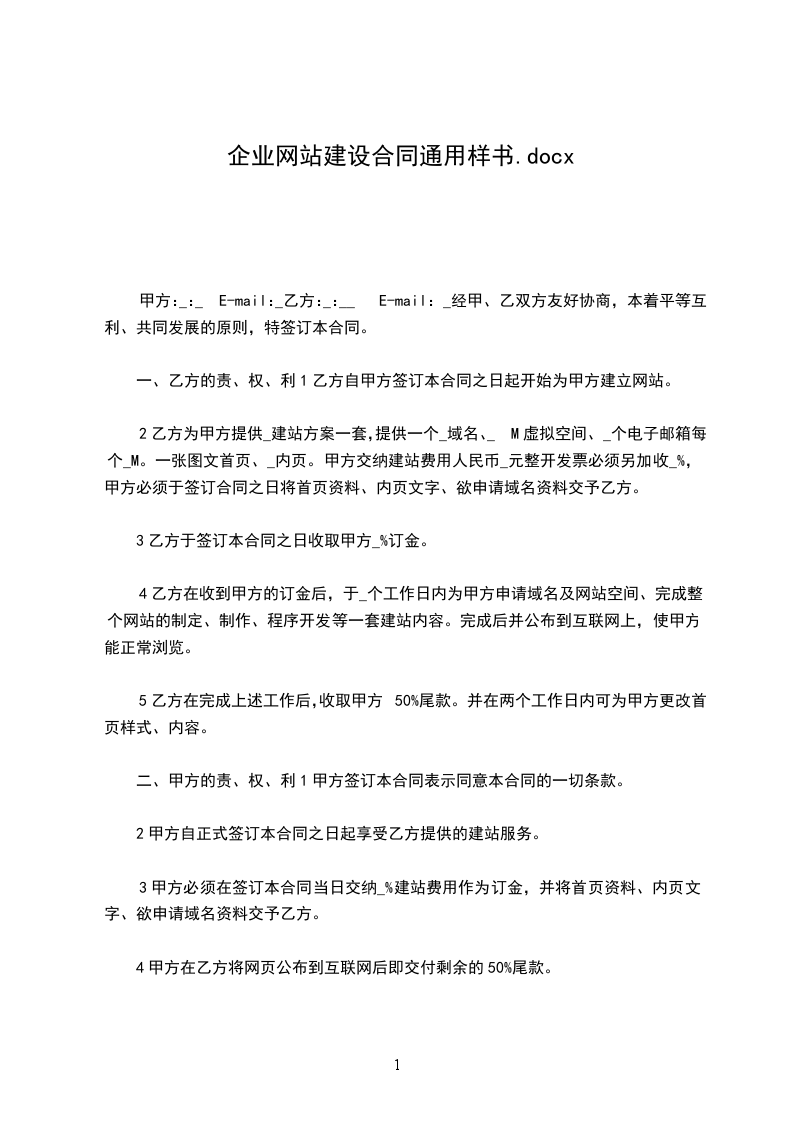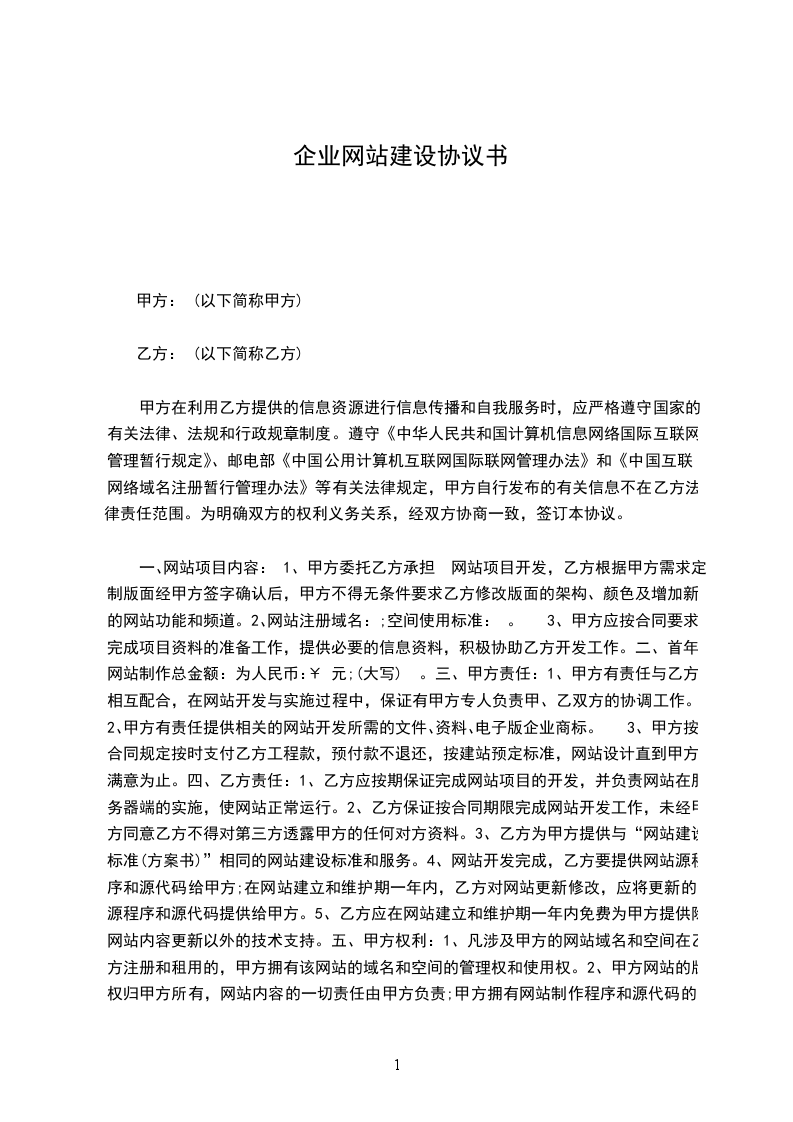 2乙方为甲方提供_建站方案一套,提供一个_域名、_M虚拟空间、_个电子邮箱每个_M。一张图文首页、_内页。甲方交纳建站费用人民币_元整开发票必须另加收_%,甲方必须于签订合同之日将首页资料、内页文字、欲申请域名资料交予乙方。