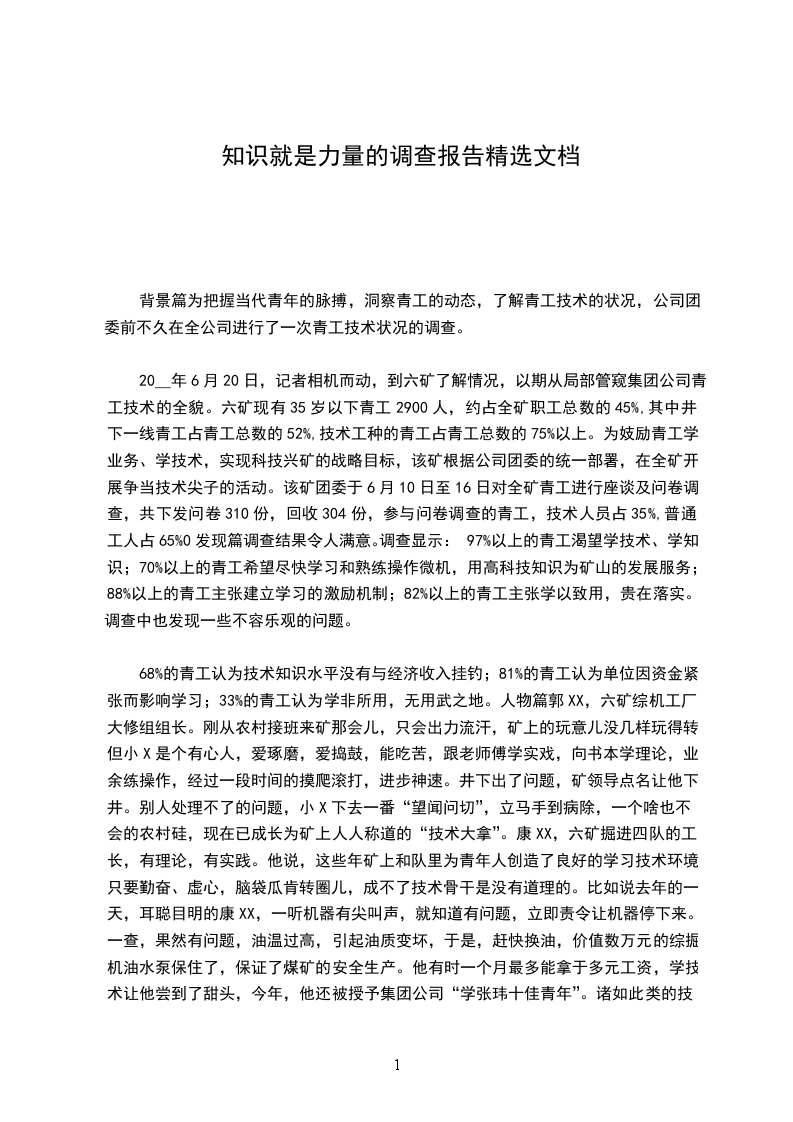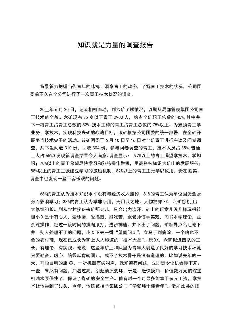 68%的青工认为技术知识水平没有与经济收入挂钓;81%的青工认为单位因资金紧张而影响学习;33%的青工认为学非所用,无用武之地。人物篇郭XX,六矿综机工厂大修组组长。刚从农村接班来矿那会儿,只会出力流汗,矿上的玩意儿没几样玩得转,但小X是个有心人,爱琢磨,爱捣鼓,能吃苦,跟老师傅学实戏,向书本学理论,业余练操作,经过一段时间的摸爬滚打,进步神速。井下出了问题,矿领导点名让他下井。别人处理不了的问题,小X下去一番“望闻问切”,立马手到病除,一个啥也不会的农村硅,现在已成长为矿上人人称道的“技术大拿”。康XX,六矿掘进四队的工长,有理论,有实践。他说,这些年矿上和队里为青年人创造了良好的学习技术环境,只要勤奋、虚心,脑袋瓜肯转圈儿,成不了技术骨干是没有道理的。比如说去年的一天,耳聪目明的康XX,一听机器有尖叫声,就知道有问题,立即责令让机器停下来。一查,果然有问题,油温过高,引起油质变坏,于是,赶快换油,价值数万元的综掘机油水泵保住了,保证了煤矿的安全生产。他有时一个月最多能拿于多元工资,学技术让他尝到了甜头,今年,他还被授予集团公司“学张玮十佳青年”。诸如此类的技术尖子在六矿不胜枚举,且层出不穷。展望篇从六矿的青年技术状况可以看出公司青工的整体技术素质。时代呼唤人才,矿山需要人才。人人都是人才,重在发现,重在创造成才的条,也重在岗位成才。知识就是力量,用知识增加内在的技术能量,真正让知识青年、技术人才吃香,让科技为矿山插上腾飞的翅膀。