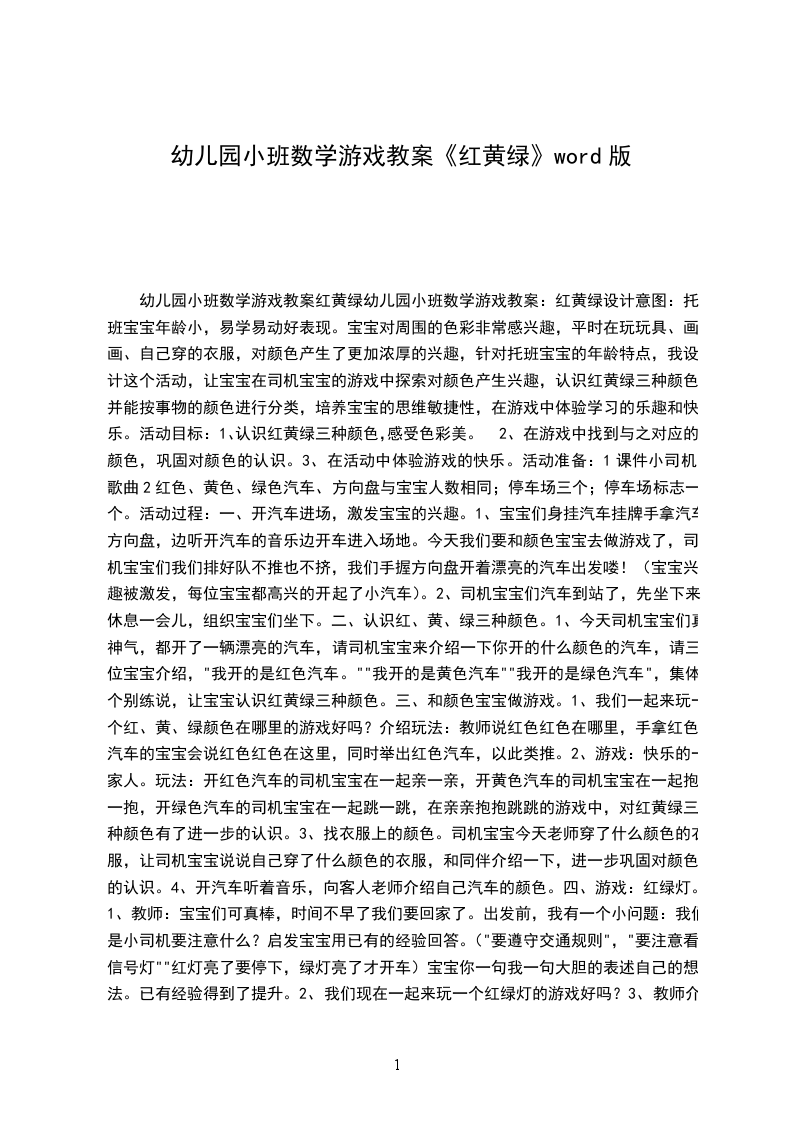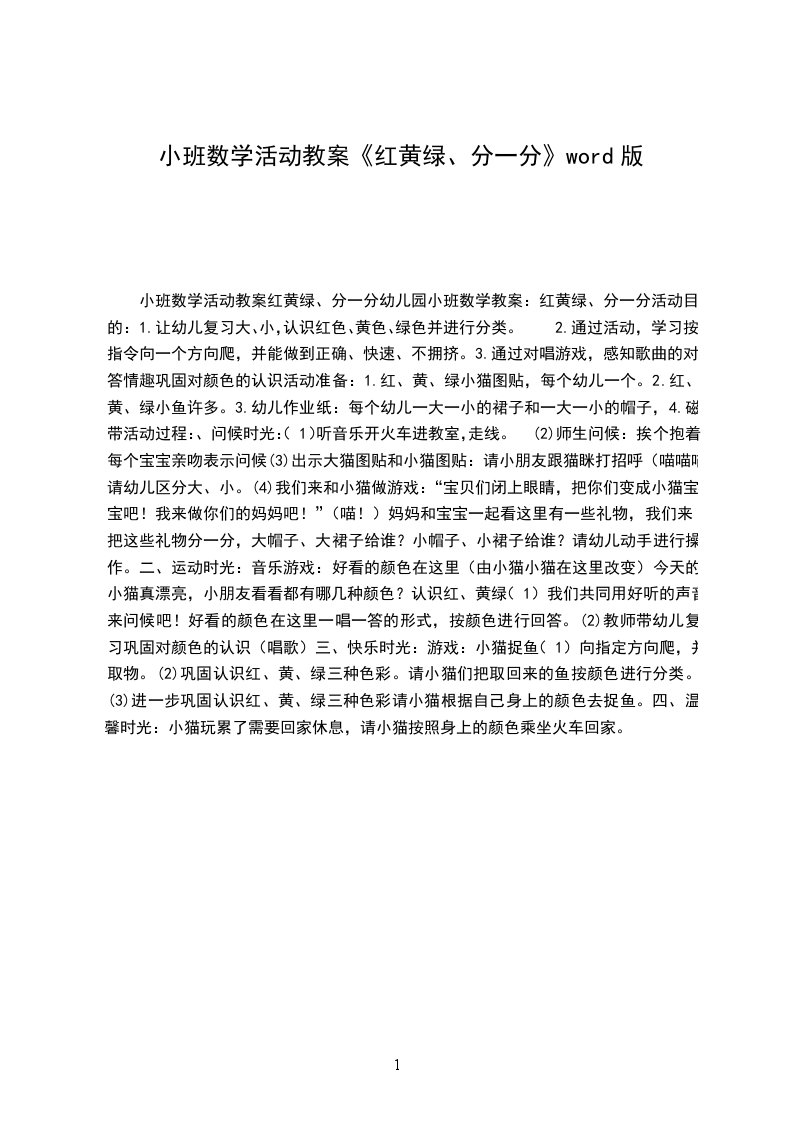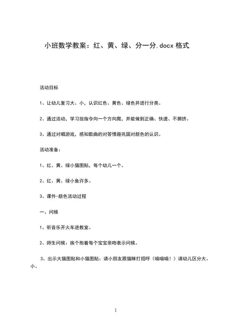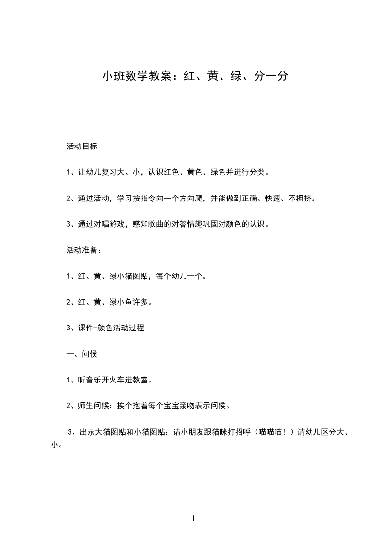 1、让幼儿复习大、小,认识红色、黄色、绿色并进行分类。