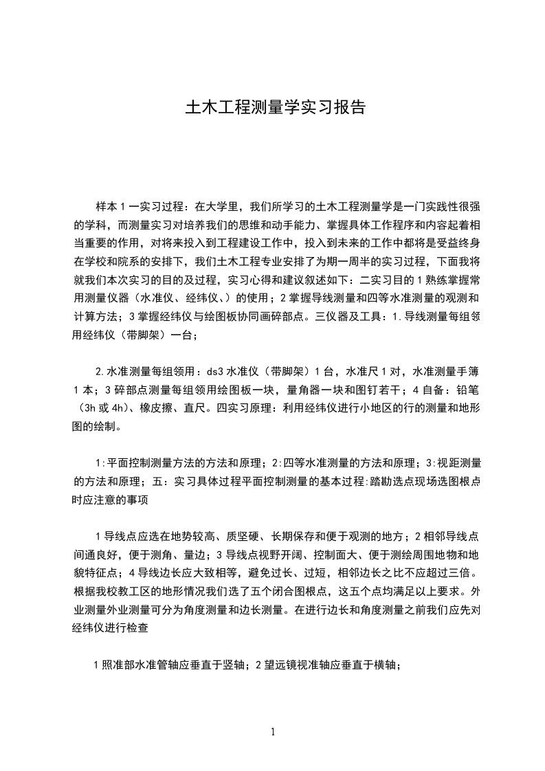 样本1一实习过程:在大学里,我们所学习的土木工程测量学是一门实践性很强的学科,而测量实习对培养我们的思维和动手能力、掌握具体工作程序和内容起着相当重要的作用,对将来投入到工程建设工作中,投入到未来的工作中都将是受益终身,在学校和院系的安排下,我们土木工程专业安排了为期一周半的实习过程,下面我将就我们本次实习的目的及过程,实习心得和建议叙述如下:二实习目的1熟练掌握常用测量仪器(水准仪、经纬仪、)的使用;2掌握导线测量和四等水准测量的观测和计算方法;3掌握经纬仪与绘图板协同画碎部点。三仪器及工具:1.导线测量每组领用经纬仪(带脚架)一台;