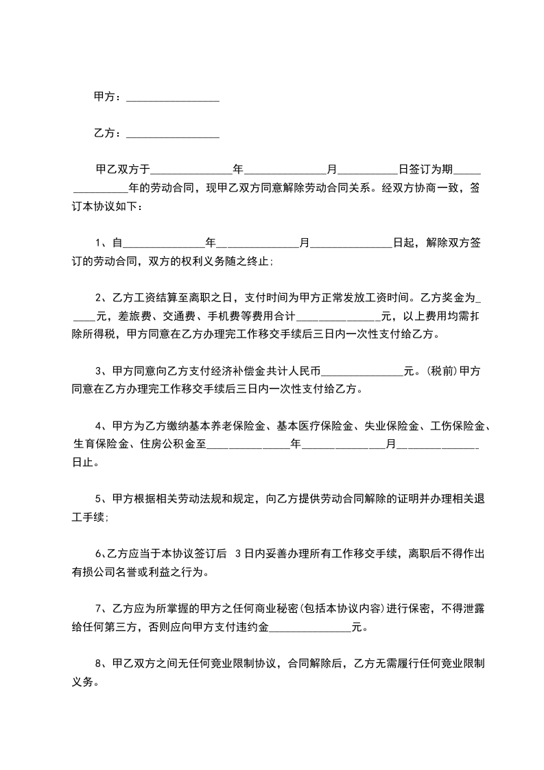 1、自_______________年_______________月_______________日起,解除双方签订的劳动合同,双方的权利义务随之终止;