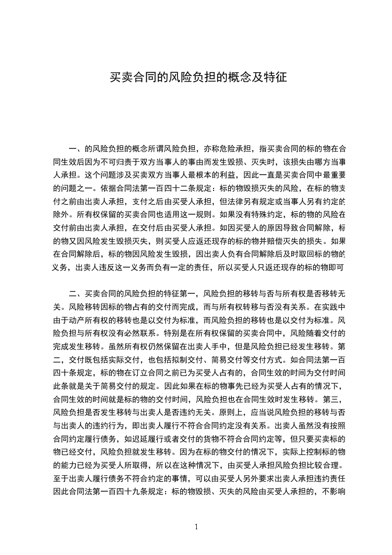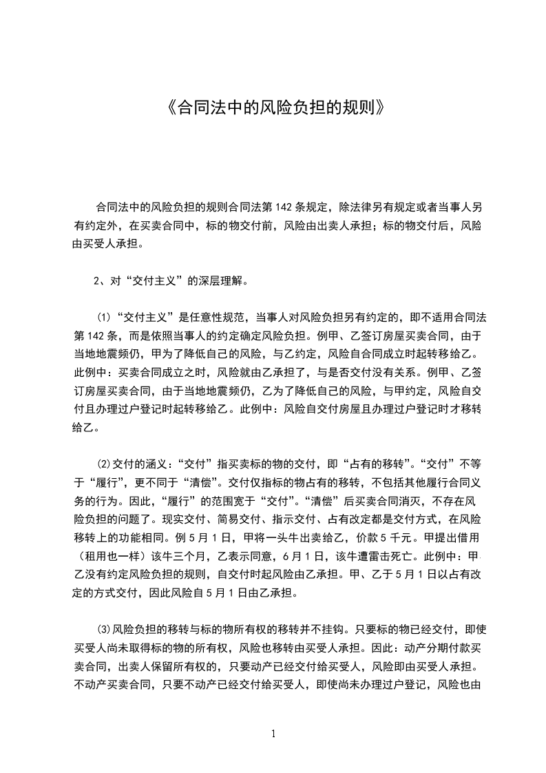 根据第142条的规定,我国的风险负担制度以交付主义为一般原则,在法律没有特别规定和当事人没有另行约定的情况下,风险随着标的交付二转移,这一点,与世界上的大多数国家的立法以及国际条约基木一致。由于标的物的风险随着标的物的交付而转移,因此交付时间的确定对于风险负担制度来说就显得十分重要。交付分为两种,现实交付和观念交付,对于标的物的现实交付的风险转移学术界并没有太大的异议,但对于简易交付、占有改定和指示交付等观念交付是否也能导致风险转移,学者们存在很大分歧。另一方面,由于不动产的物权变动我国采取的是登记生效主义,存在着占有转移与所有权转移相分离的情况,因此有学者认为在不动产买卖中,交付主义只适用于不动产先交付后登记的情形,而不适用于先登记后交付的情形,不动产所有权转移后即使还没有交付,买受人也应承担不动产损毁灭失的风险。