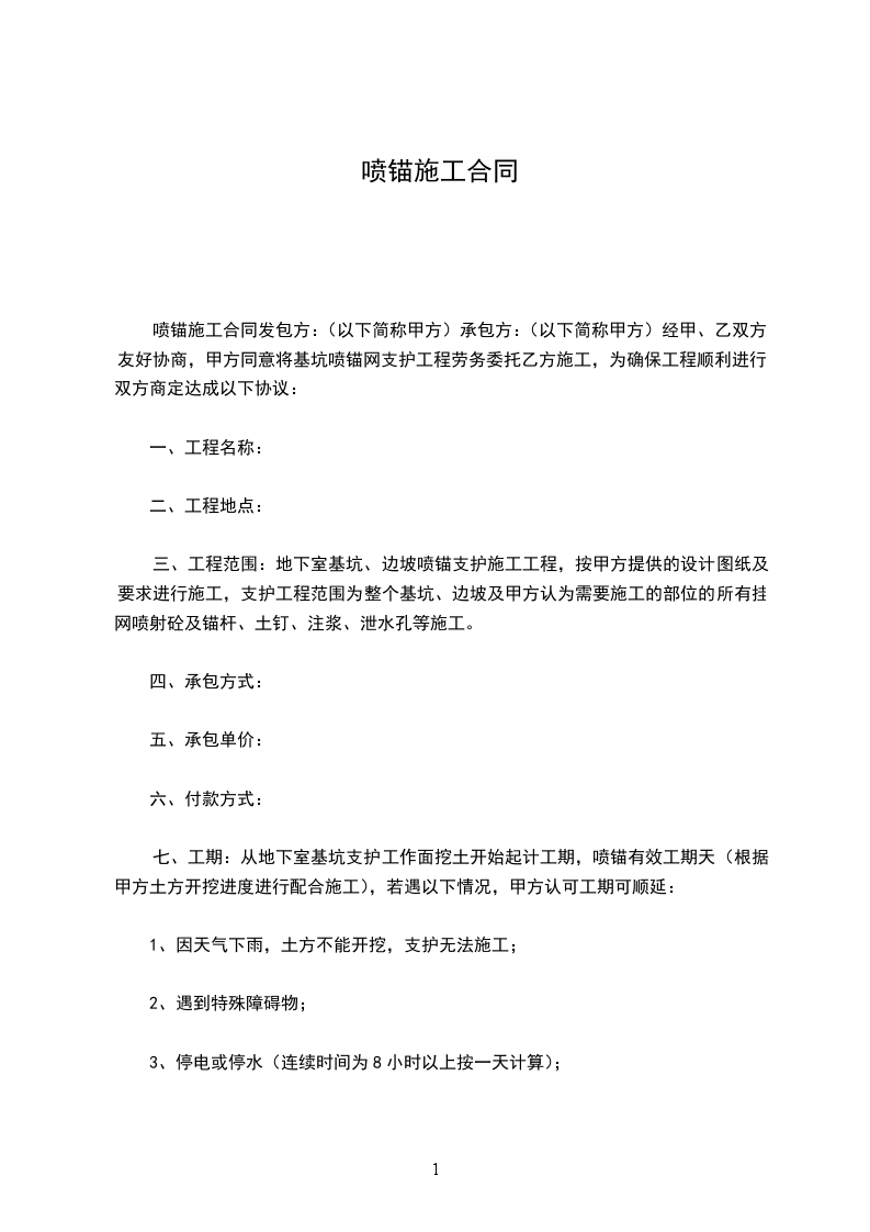 喷锚施工合同发包方:(以下简称甲方)承包方:(以下简称甲方)经甲、乙双方友好协商,甲方同意将基坑喷锚网支护工程劳务委托乙方施工,为确保工程顺利进行,双方商定达成以下协议: