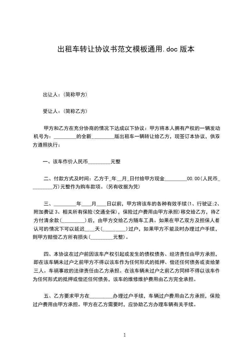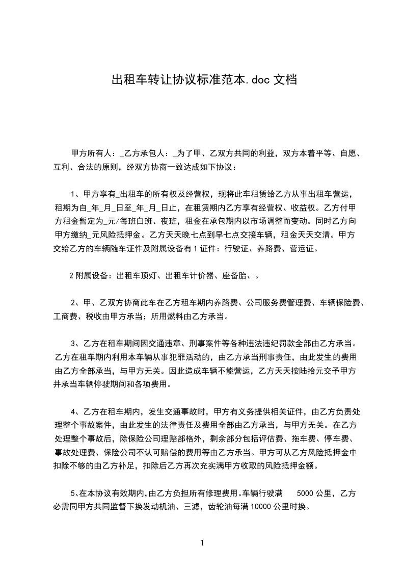 1、甲方享有_的所有权及经营权,现将此车租赁给乙方从事出租车营运,租期为自_年_月_日至_年_月_日止,在租赁期内乙方享有经营权、收益权。乙方付甲方租金暂定为_元/每班(白班、夜班),租金在承包期内以市场调整而变动。同时乙方向甲方缴纳_元风险抵押金。乙方天天晚七点到早七点交接车辆,租金天天交清。甲方交给乙方的车辆随车证件及附属设备有:(1)证件:行驶证、养路费、营运证。