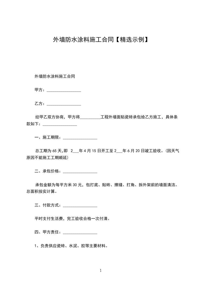 外墙防水工程施工合同外墙防水工程施工合同根据和建筑安装工程承包合同条款及有关规定,为明确双方在施工过程中的权利,义务和责任,就本次工程防水施工有关事项经双方协商达成如下协议:第一条工程项目工程名称:工程地点:承包方式:工程量:施工部位:施工期限:单价:第二条甲方工作委托为甲方驻工地代表,负责合同履行,对工程质量、进度进行监督检查,办理验收、变更、登记手续和其他事项。