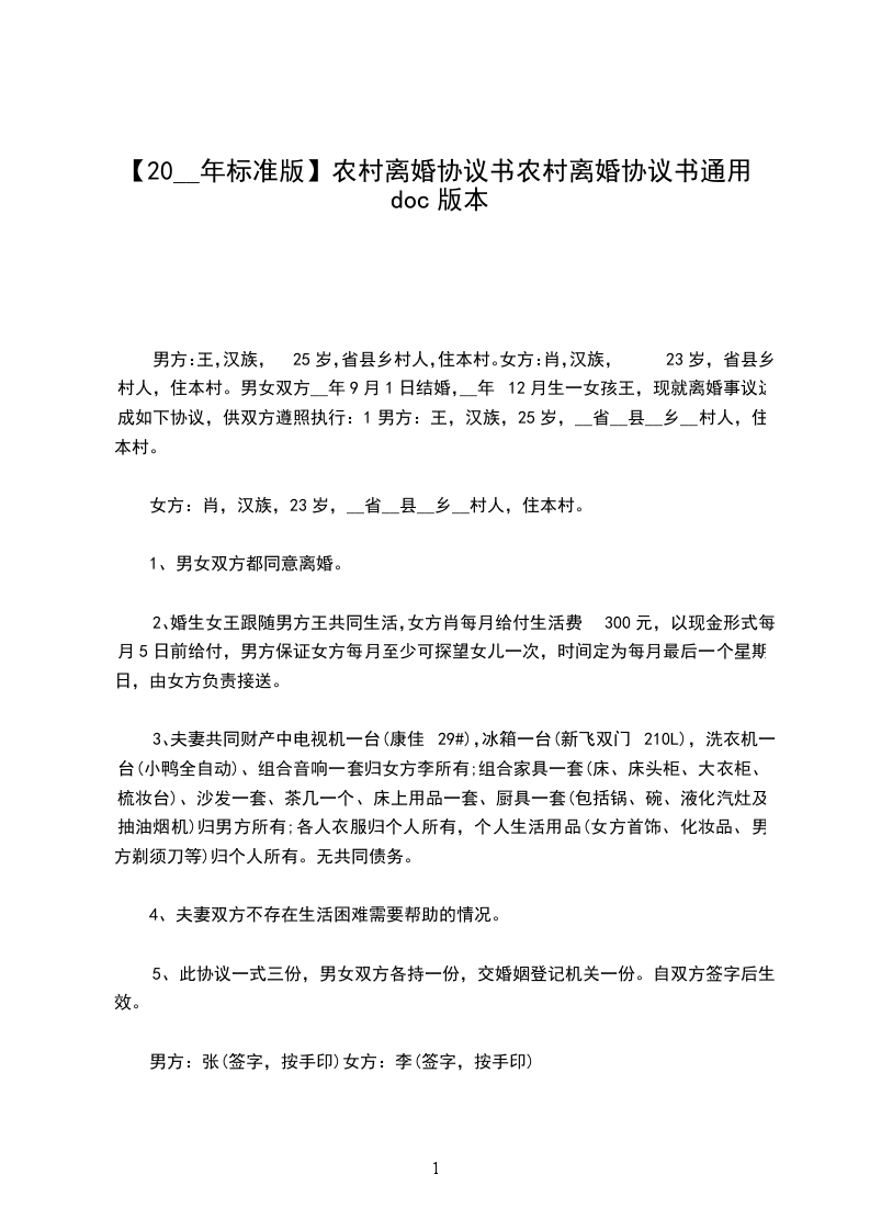 农村离婚协议书范本(版)农村离婚协议书范本(版)男方:王,汉族,25岁,省县乡村人,住本村。女方:肖,汉族,23岁,省县乡村人,住本村。男女双方1998年9月1日结婚,1999年12月生一女孩王,现就离婚事议达成如农村离婚协议书范本(版)男方:王__,汉族,25岁,__省__县__乡__村人,住本村。女方:肖__,汉族,23岁,__省__县__乡__村人,住本村。男女双方都同意离婚。婚生女王__跟随男方王__共同生活,女方肖__每月给付生活费300元,以现金形式每月5日前给付,男方保证女方每月至少可探望女儿一次,时间定为每月最后一个星期日,由女方负责接送。夫妻共同财产中电视机一台(康佳29),冰箱一台(新飞双门210L),洗衣机一台(小鸭全自动)、组合音响一套归女方李__所有;组合家具一套(床、床头柜、大衣柜、梳妆台)、沙发一套、茶几一个、床上用品一套、厨具一套(包括锅、碗、液化汽灶及抽油烟机)归男方所有;各人衣服归个人所有,个人生活用品(女方首饰、化妆品、男方剃须刀等)归个人所有。无共同债务。夫妻双方不存在生活困难需要帮助的情况。此农村离婚协议书范本一式三份,男女双方各持一份,交婚姻登记机关一份。自双方签字后生效。男方:张__(签字,按手印)女方:李X_(签字,按手印)20__年_月_日20__年_月_日