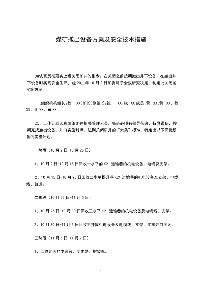 二、工作计划认真组织矿井相关管理人员,每班必须有领导带班、特员跟班,按期完成撤出设备、井口实施封填,达到关闭矿井的“六条”标准,特定出以下回撤设备的实施计划。