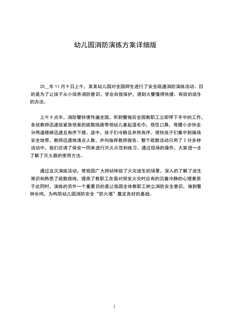 20__年11月9日上午,某某幼儿园对全园师生进行了安全疏通消防演练活动。目的是为了让孩子从小培养消防意识,学会自我保护,遇到火警懂得快捷、有效的逃生的办法。
