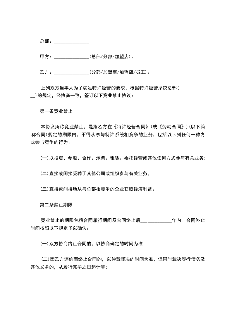 上列双方当事人为了满足特许经营的要求,根据特许经营系统总部(_____________)的规定,经协商一致,签订以下竞业禁止协议: