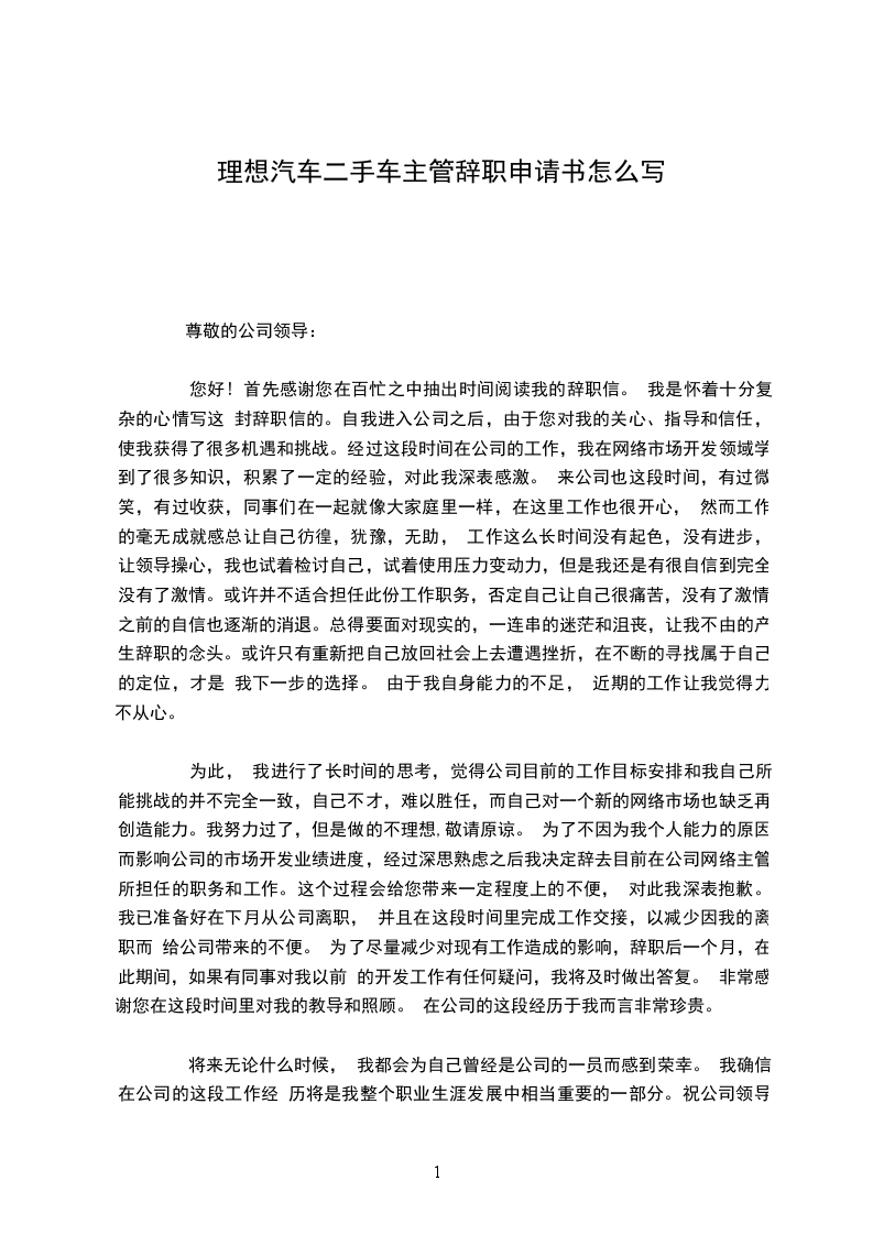 为此, 我进行了长时间的思考,觉得公司目前的工作目标安排和我自己所能挑战的并不完全一致,自己不才,难以胜任,而自己对一个新的网络市场也缺乏再创造能力。我努力过了,但是做的不理想,敬请原谅。 为了不因为我个人能力的原因而影响公司的市场开发业绩进度,经过深思熟虑之后我决定辞去目前在公司网络主管所担任的职务和工作。这个过程会给您带来一定程度上的不便, 对此我深表抱歉。我已准备好在下月从公司离职, 并且在这段时间里完成工作交接,以减少因我的离职而 给公司带来的不便。 为了尽量减少对现有工作造成的影响,辞职后一个月,在此期间,如果有同事对我以前 的开发工作有任何疑问,我将及时做出答复。 非常感谢您在这段时间里对我的教导和照顾。 在公司的这段经历于我而言非常珍贵。