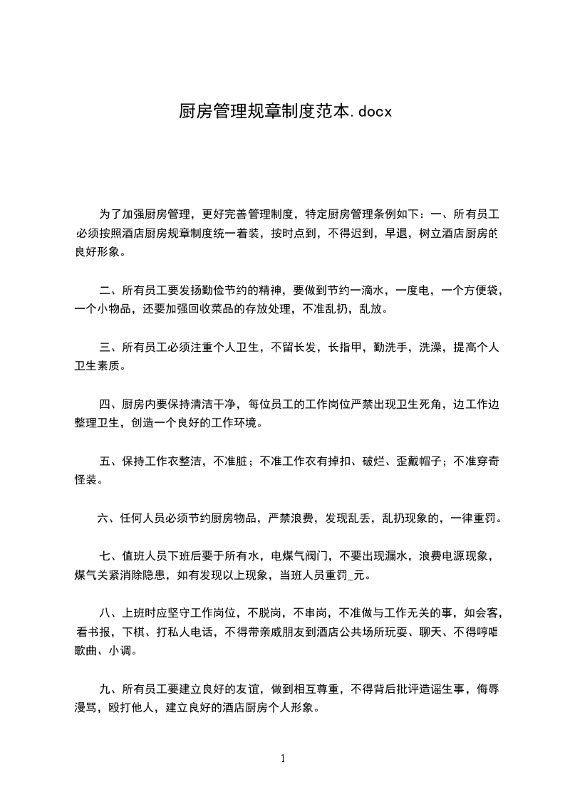 为了加强厨房管理,更好完善管理制度,特定厨房管理条例如下:一、所有员工必须按照酒店厨房规章制度统一着装,按时点到,不得迟到,早退,树立酒店厨房的良好形象。