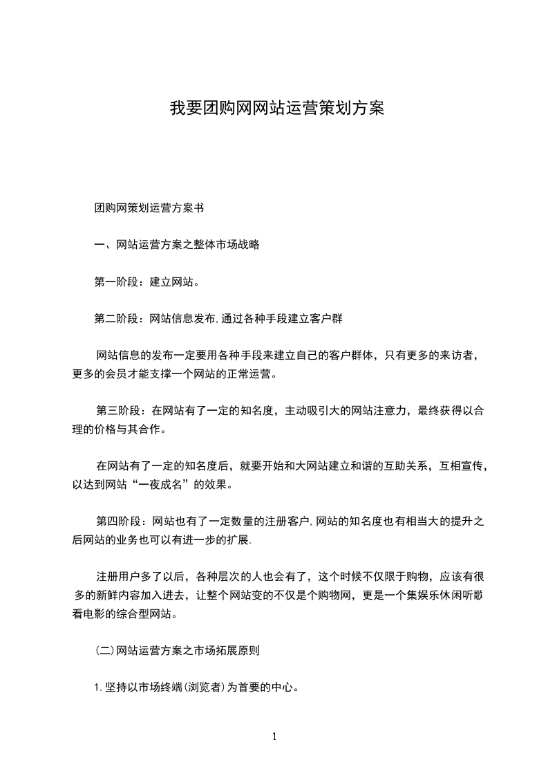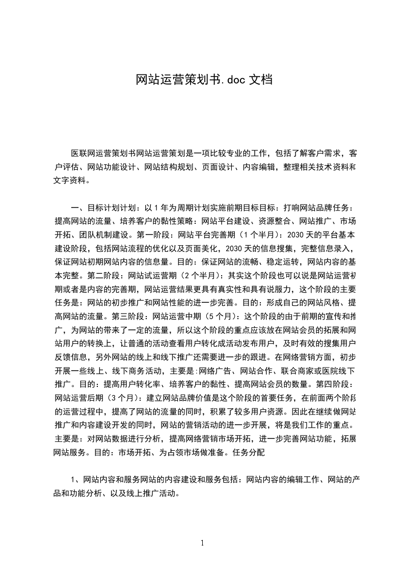 一、目标计划计划:以1年为周期计划实施前期目标目标:打响网站品牌任务:提高网站的流量、培养客户的黏性策略:网站平台建设、资源整合、网站推广、市场开拓、团队机制建设。第一阶段:网站平台完善期(1个半月):2030天的平台基本建设阶段,包括网站流程的优化以及页面美化,2030天的信息搜集,完整信息录入,保证网站初期网站内容的信息量。目的:保证网站的流畅、稳定运转,网站内容的基本完整。第二阶段:网站试运营期(2个半月):其实这个阶段也可以说是网站运营初期或者是内容的完善期,网站运营结果更具有真实性和具有说服力,这个阶段的主要任务是:网站的初步推广和网站性能的进一步完善。目的:形成自己的网站风格、提高网站的流量。第三阶段:网站运营中期(5个月):这个阶段的由于前期的宣传和推广,为网站的带来了一定的流量,所以这个阶段的重点应该放在网站会员的拓展和网站用户的转换上,让普通的活动查看用户转化成活动发布用户,及时有效的搜集用户反馈信息,另外网站的线上和线下推广还需要进一步的跟进。在网络营销方面,初步开展一些线上、线下商务活动,主要是:网络广告、网站合作、联合商家或医院线下推广。目的:提高用户转化率、培养客户的黏性、提高网站会员的数量。第四阶段:网站运营后期(3个月):建立网站品牌价值是这个阶段的首要任务,在前面两个阶段的运营过程中,提高了网站的流量的同时,积累了较多用户资源。因此在继续做网站推广和内容建设开发的同时,网站的营销活动的进一步开展,将是我们工作的重点。主要是:对网站数据进行分析,提高网络营销市场开拓,进一步完善网站功能,拓展网站服务。目的:市场开拓、为占领市场做准备。任务分配