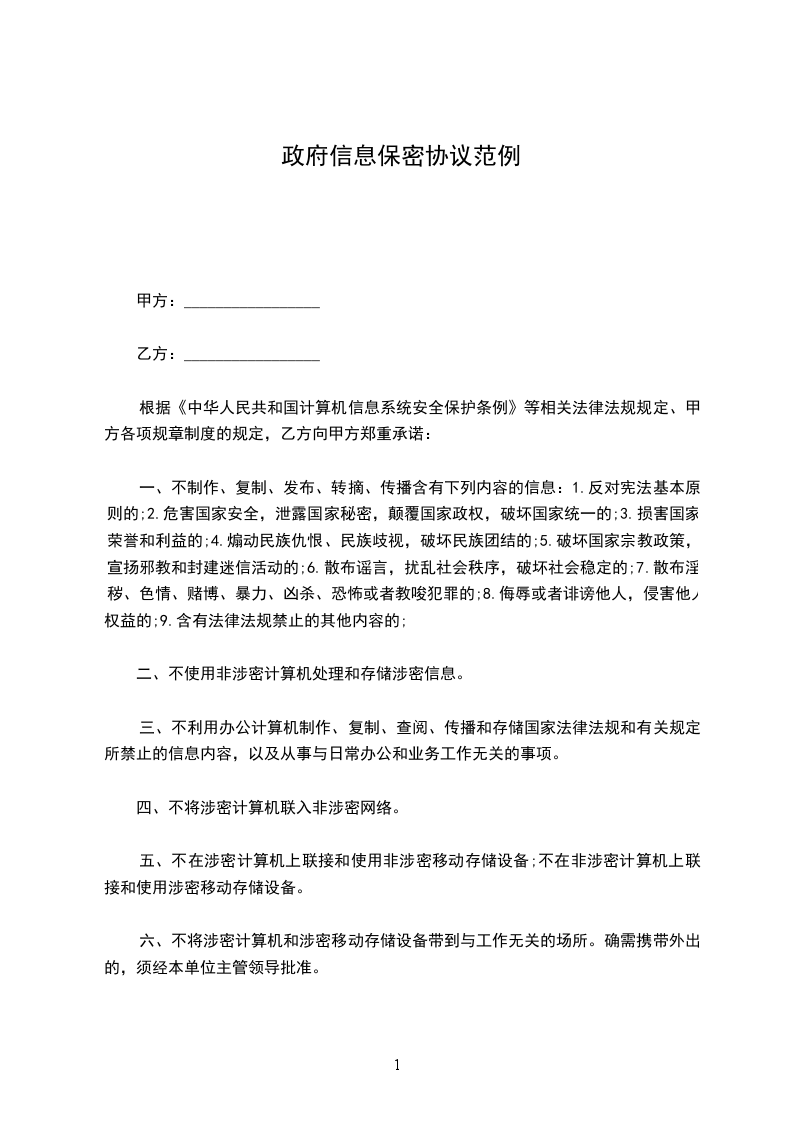 根据《中华人民共和国计算机信息系统安全保护条例》等相关法律法规规定、甲方各项规章制度的规定,乙方向甲方郑重承诺: