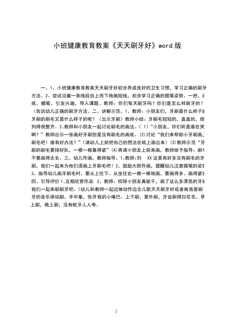 2、教师:哎呀小朋友真能干,画了这么多漂亮的牙刷。我们一起来刷刷牙吧。(幼儿和教师一起边做动作边念儿歌天天刷牙好或者做我爱刷牙的音乐律动附:天天刷牙好小牙刷,手中拿,张开我的小嘴巴。上下刷,里外刷,牙齿刷得白花花。早上刷,晚上刷,没有蛀牙人人夸