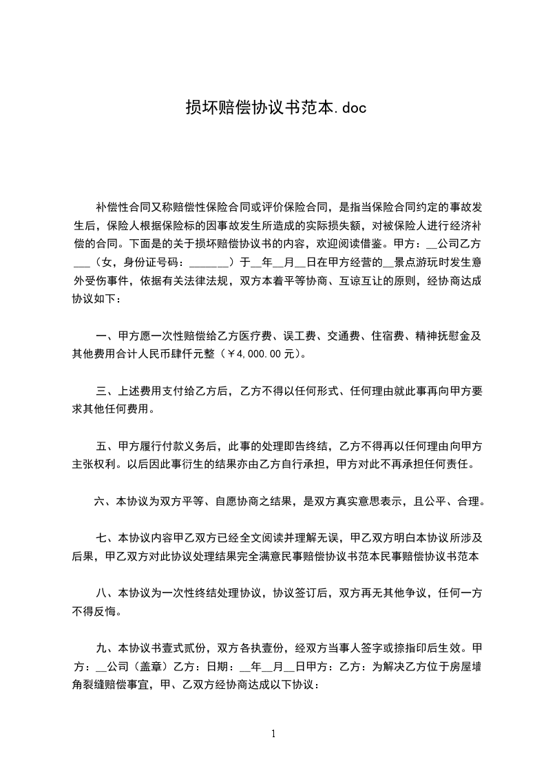 补偿性合同又称赔偿性保险合同或评价保险合同,是指当保险合同约定的事故发生后,保险人根据保险标的因事故发生所造成的实际损失额,对被保险人进行经济补偿的合同。下面是的关于损坏赔偿协议书的内容,欢迎阅读借鉴。甲方:__公司乙方:___(女,身份证号码:_______)于__年__月__日在甲方经营的__景点游玩时发生意外受伤事件,依据有关法律法规,双方本着平等协商、互谅互让的原则,经协商达成协议如下: