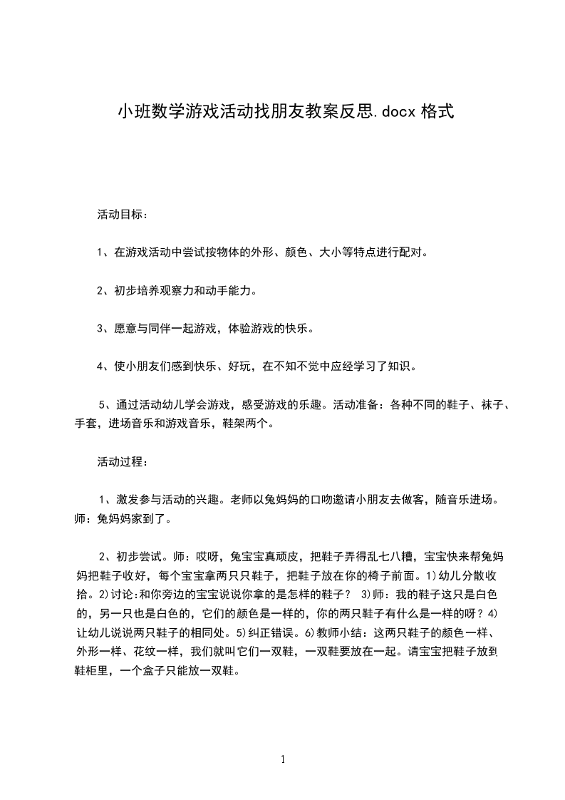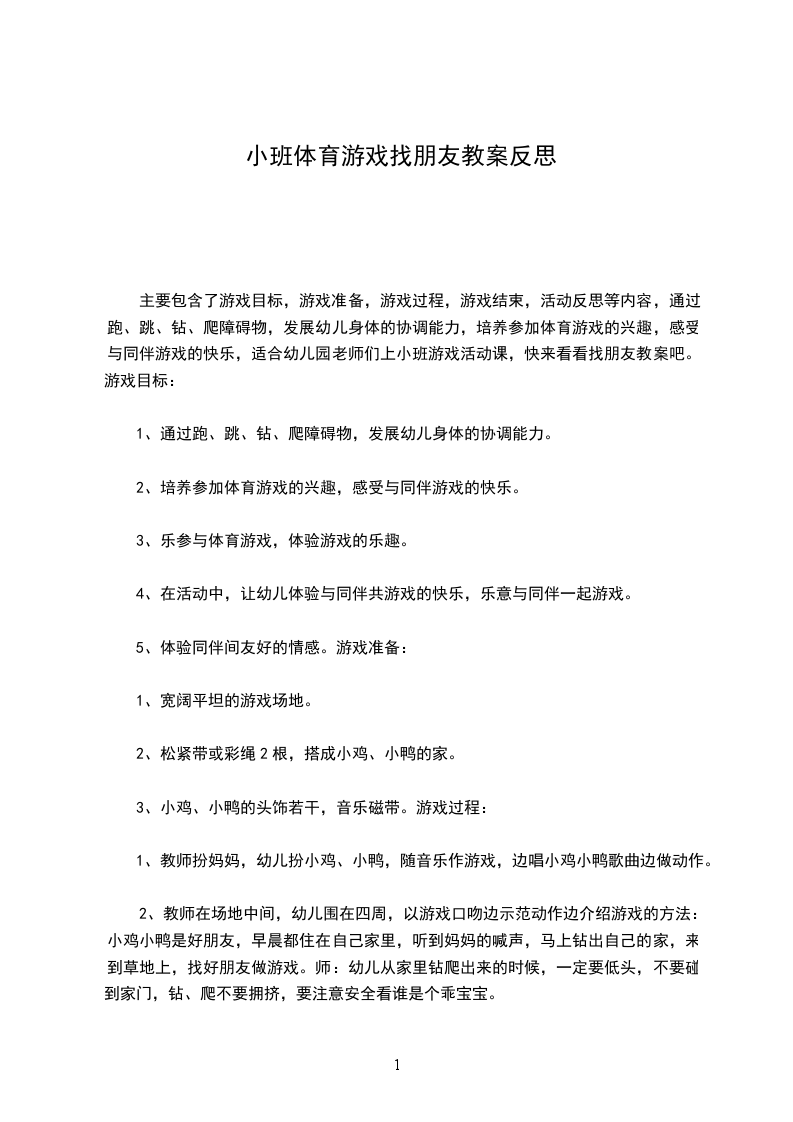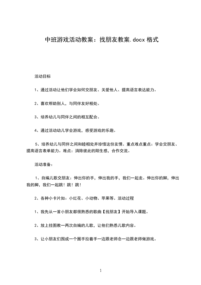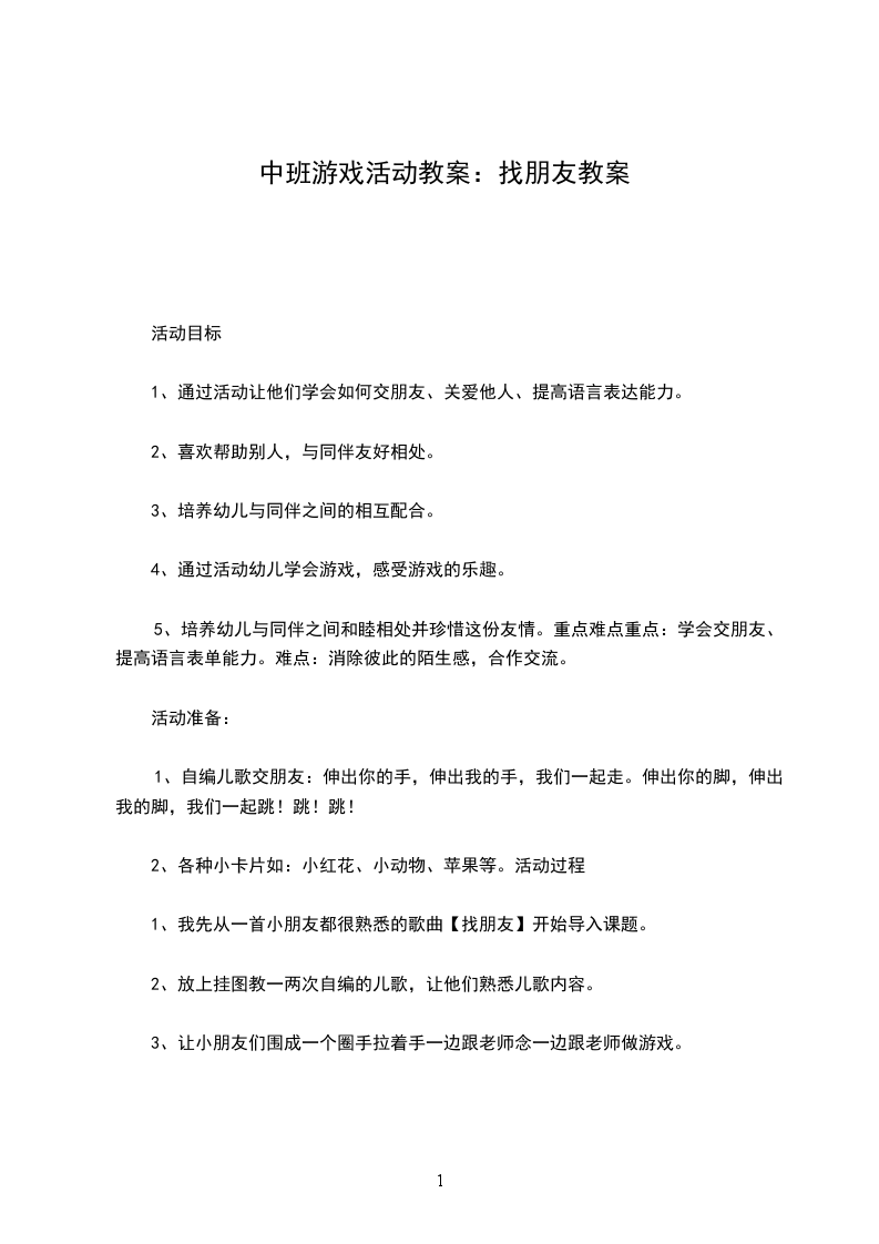 5、让小朋友再次巩固儿歌【找朋友】结束后让小朋友记得放学回家后与家人一起分享交朋友的乐趣。教学反思本次活动幼儿从中学会了交朋友、学会了尊重彼此,游戏中乐其融融,玩得很开心,消除了彼此的陌生感。唯一不足的是我没有考虑到中班年龄特点这个问题,活动时间太长,有些小朋友不久就累了,跳不动了。我应该做一两次游戏后让小朋友坐在椅子上继续其他游戏互动交流。
