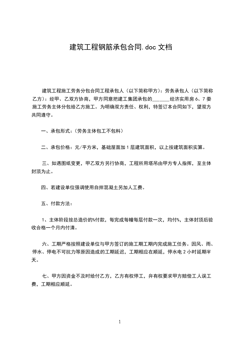 建筑工程施工劳务分包合同工程承包人(以下简称甲方):劳务承包人(以下简称乙方):经甲、乙双方协商,甲方同意把建工集团承包的_______经济实用房6、7娄施工劳务主体分包给乙方施工。为明确双方责任、权利,特签订本合同如下,望双方共同遵守。