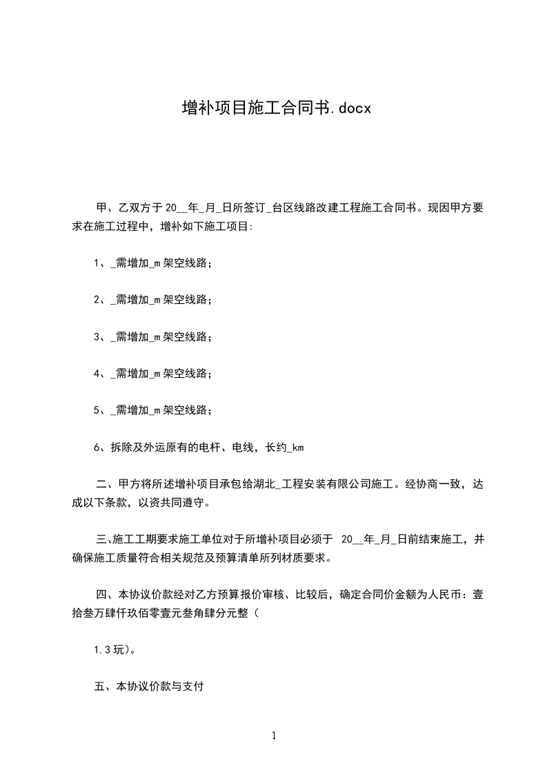 甲、乙双方于20__年_月_日所签订_台区线路改建工程施工合同书。现因甲方要求在施工过程中,增补如下施工项目: