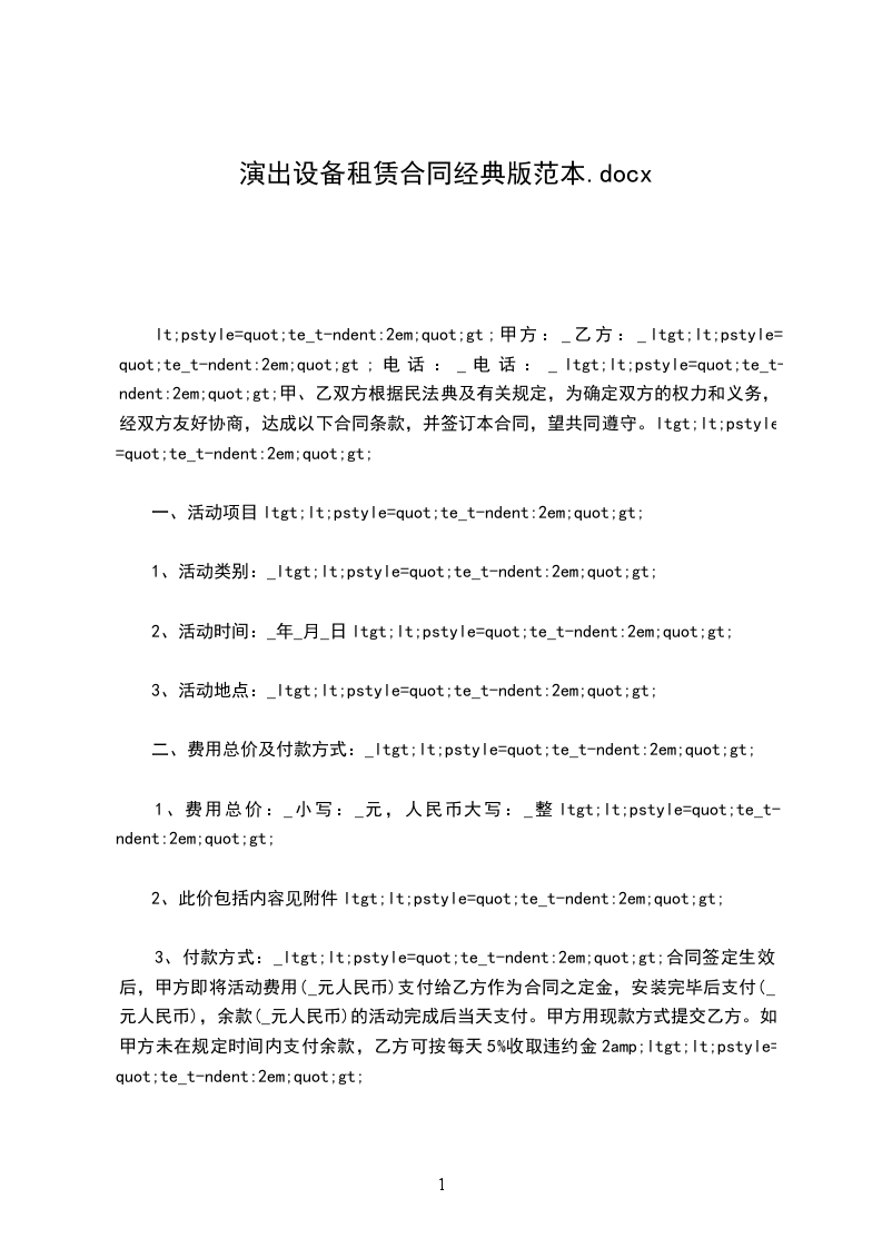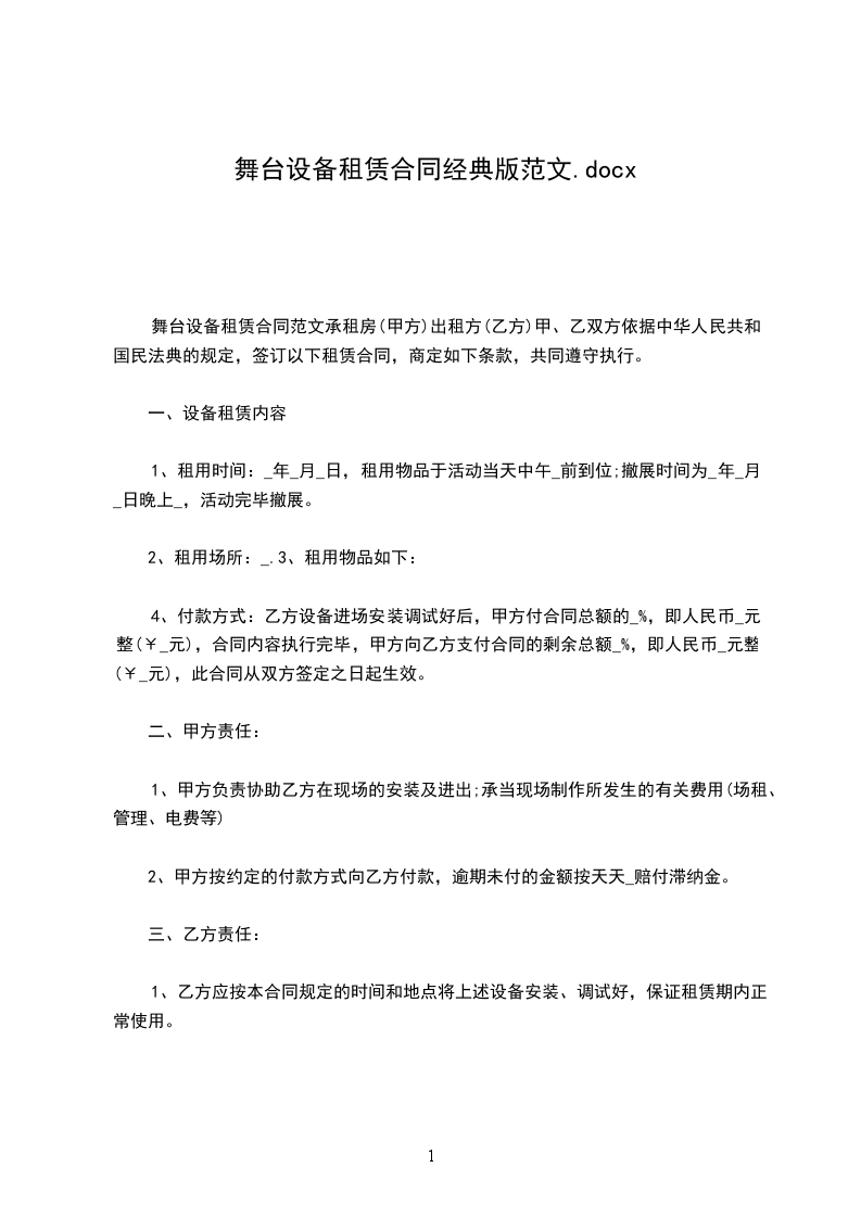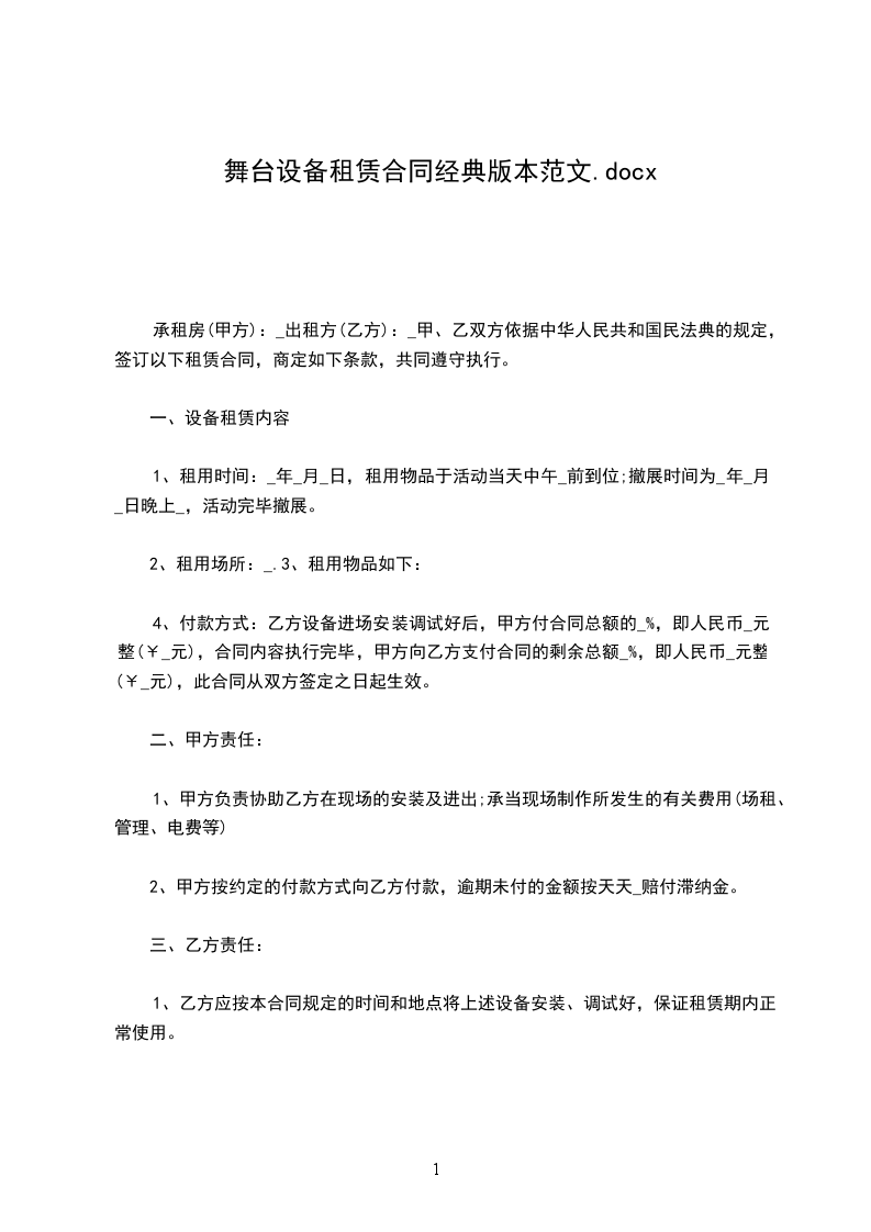 1、租赁期_天(即一个月)即_年_月_日至_年_月_日止,到期甲方一次性付清乙方租赁费。