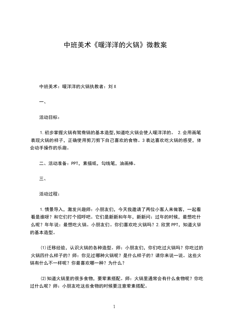 (3)欣赏制作的火锅作品,说一说最喜爱的原因。师:这里还有一些特别的火锅,大家看看喜欢哪一个?师:这些师哥哥姐姐做的火锅,请你来说一说他们师怎么做的?3.幼儿交流绘画方式。师:看了这些火锅,你们想不想做一个自己设计额火锅呀?你会怎么做呢?先做什么?再做什么呢?最后做什么呢?4.介绍制作材料,幼儿操作,教师巡回指导。师:看,这里有一些工具和材料,可以用这些制作你喜欢吃的火锅吧。5.作品欣赏评论,讨论吃火锅会使人暖洋洋。师:火锅做好了,小朋友们喜欢哪一个呀?吃完火锅会有什么感觉呢?冬天里吃有什么感觉呢?