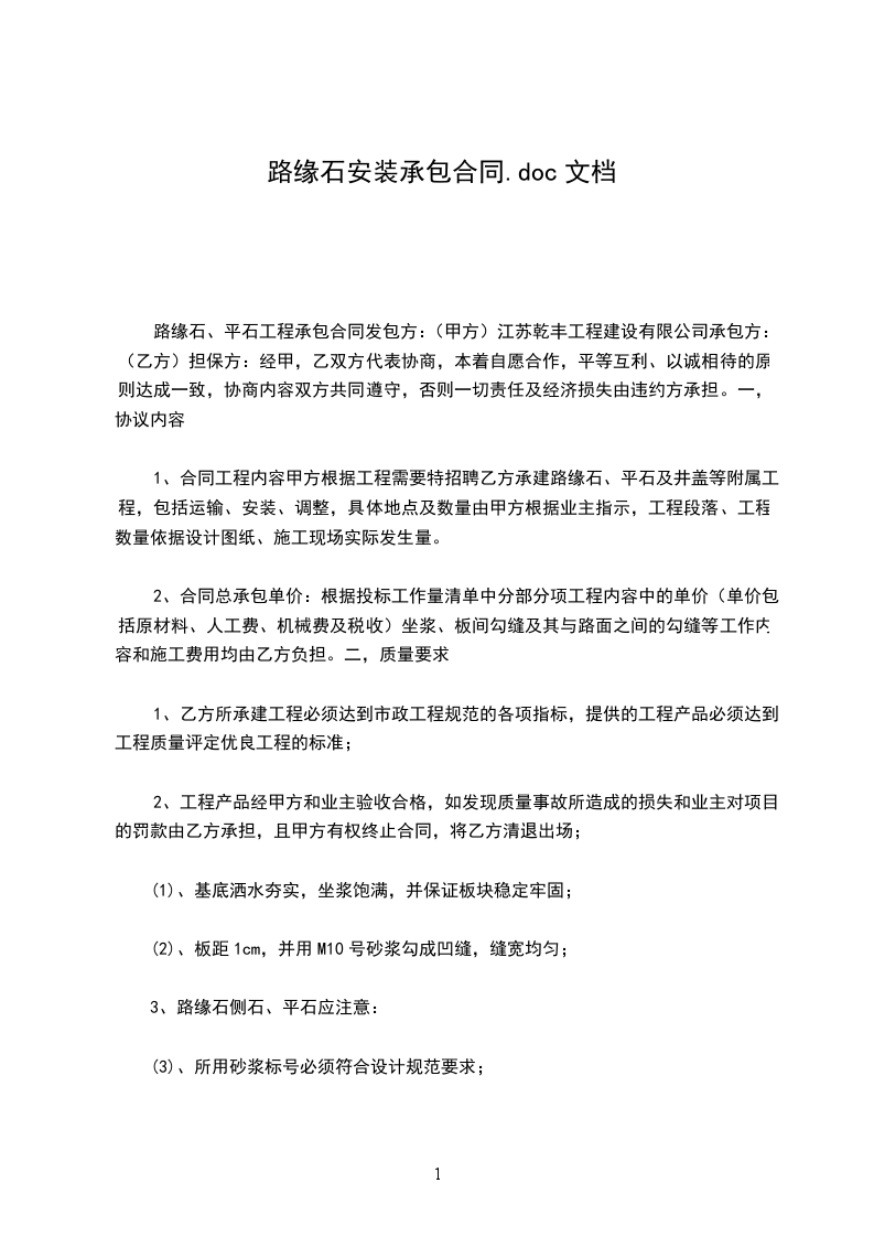 路缘石、平石工程承包合同发包方:(甲方)江苏乾丰工程建设有限公司承包方:(乙方)担保方:经甲,乙双方代表协商,本着自愿合作,平等互利、以诚相待的原则达成一致,协商内容双方共同遵守,否则一切责任及经济损失由违约方承担。一,协议内容