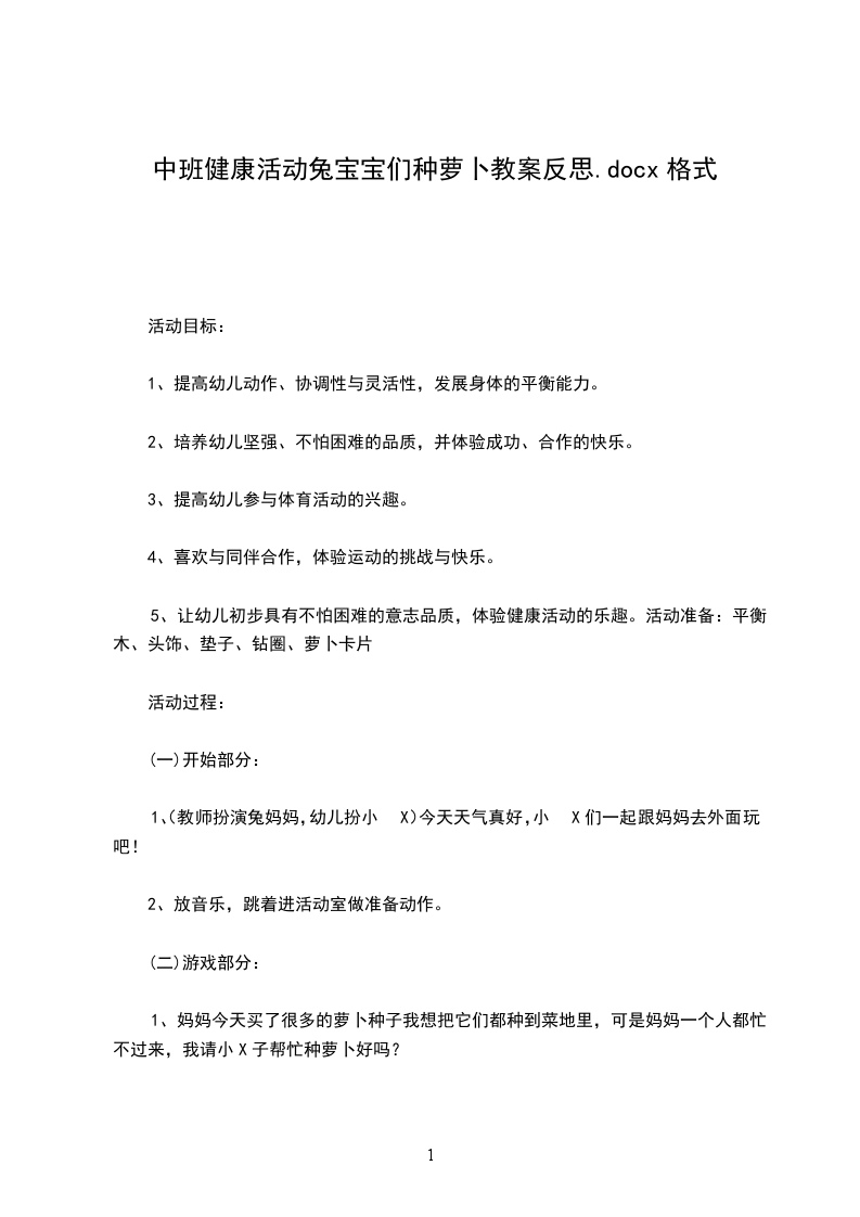 2、天不早了,我们抬着萝卜回家吧。(放音乐)活动反思:在这节课的整个活动中,幼儿能积极主动参与到活动中来,并且情绪高涨,培养了幼儿参加体育活动的兴趣和习惯,同时在体育活动中,还培养幼儿坚强勇敢、不怕困难的意志品质和主动乐观合作的态度,这与纲要中健康领域中的目标要求相吻合。