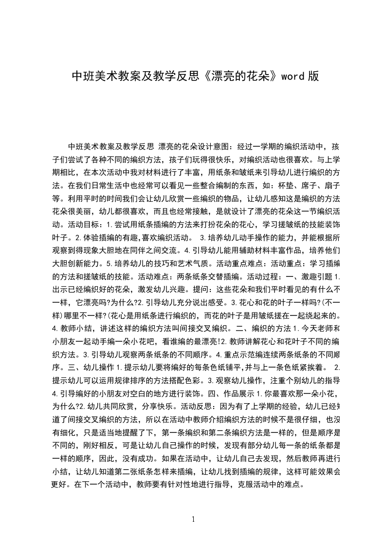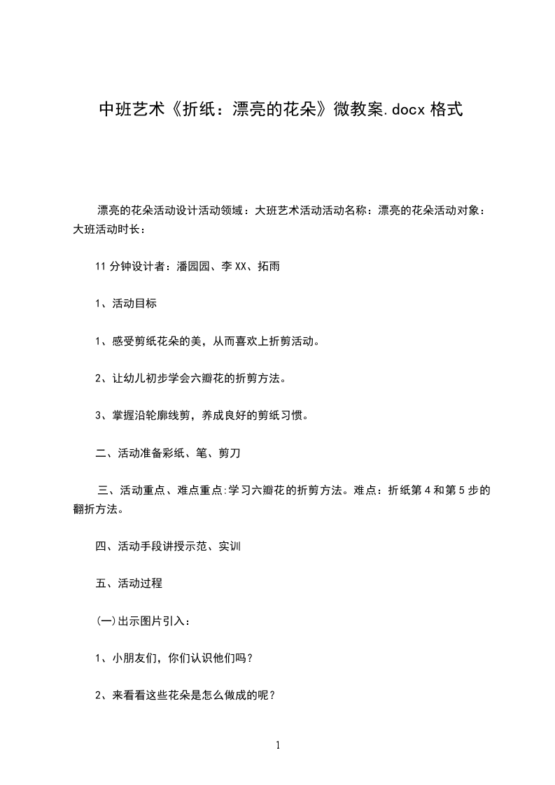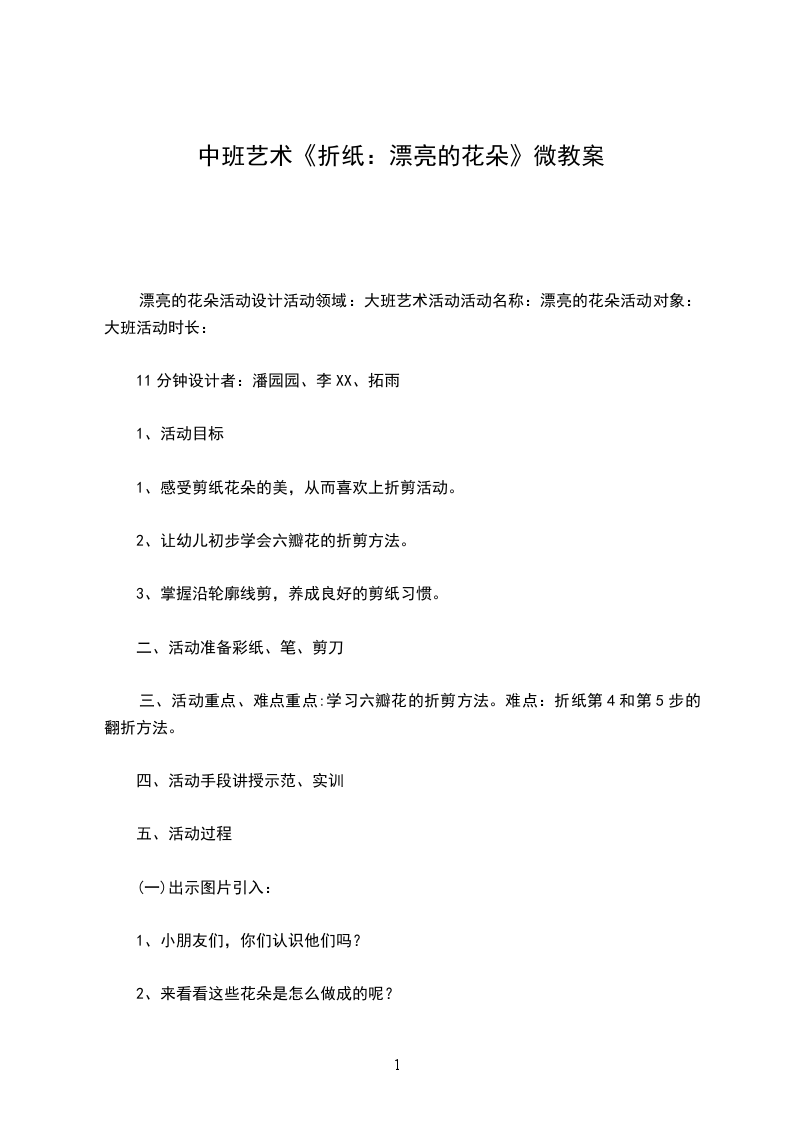 漂亮的花朵活动设计活动领域:大班艺术活动活动名称:漂亮的花朵活动对象:大班活动时长: