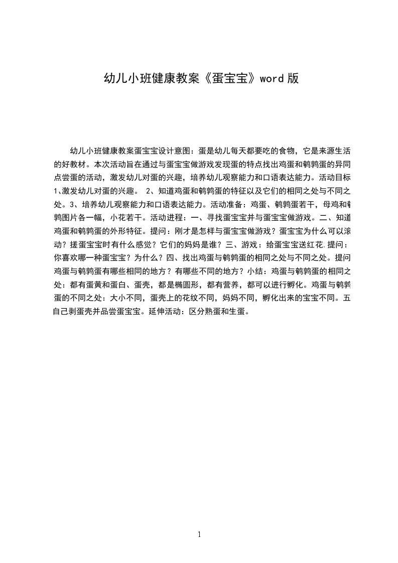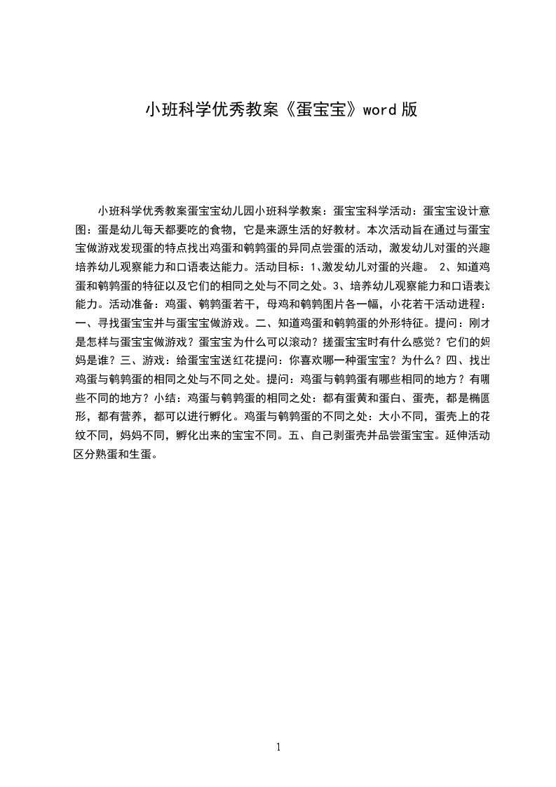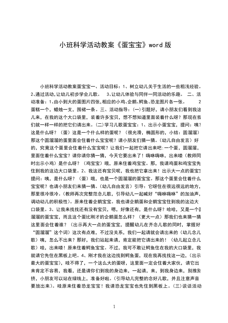 2.乐意进行观察,愿意与老师、同伴进行语言交流。活动准备:大围裙(围裙中藏有不同的蛋宝宝,如:鸡蛋宝宝、鹅蛋宝宝、鸭蛋宝宝、鹌鹑蛋宝宝)蛋宝宝图片和出壳后的小宝宝图片,生日礼物糖果(同幼儿人数)。活动流程:可爱的蛋宝宝导语:今天围裙妈妈的围裙里藏着什么呢是蛋宝宝。重点区分:一个蛋宝宝和许多蛋宝宝。小结:动物妈妈们生了许多可爱的蛋宝宝。动物宝宝过生日