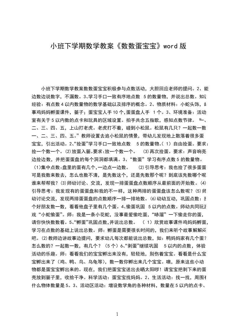 1.数数蛋宝宝提问:鸡妈妈生了几个蛋宝宝鹅妈妈生了几个蛋宝宝鸭妈妈生了几个蛋宝宝鹌鹑妈妈生了几个蛋宝宝重点关注:幼儿数数的方法,关注幼儿是否多数和漏数。小结:数数时,需要点一个数一个,不能多数也不能少数。