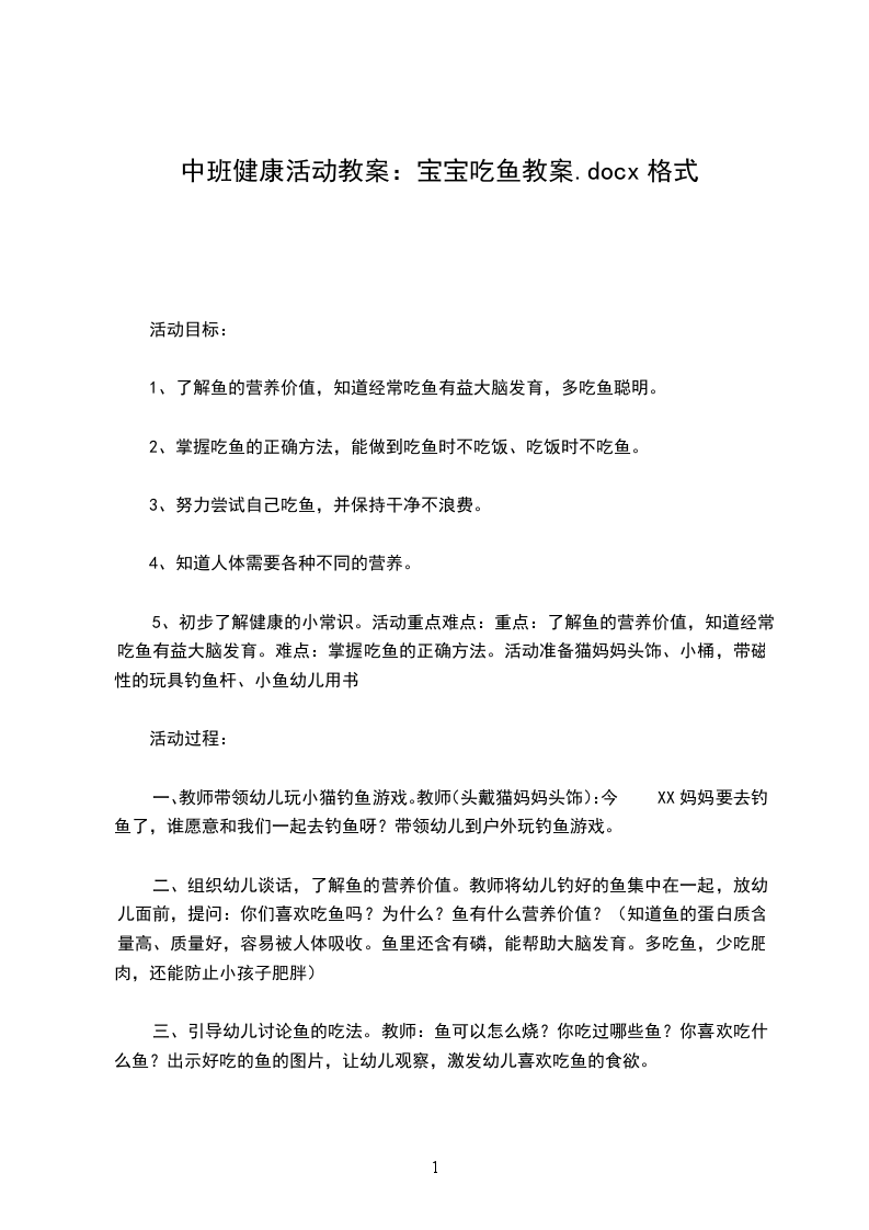 1、了解鱼的营养价值,知道经常吃鱼有益大脑发育,多吃鱼聪明。