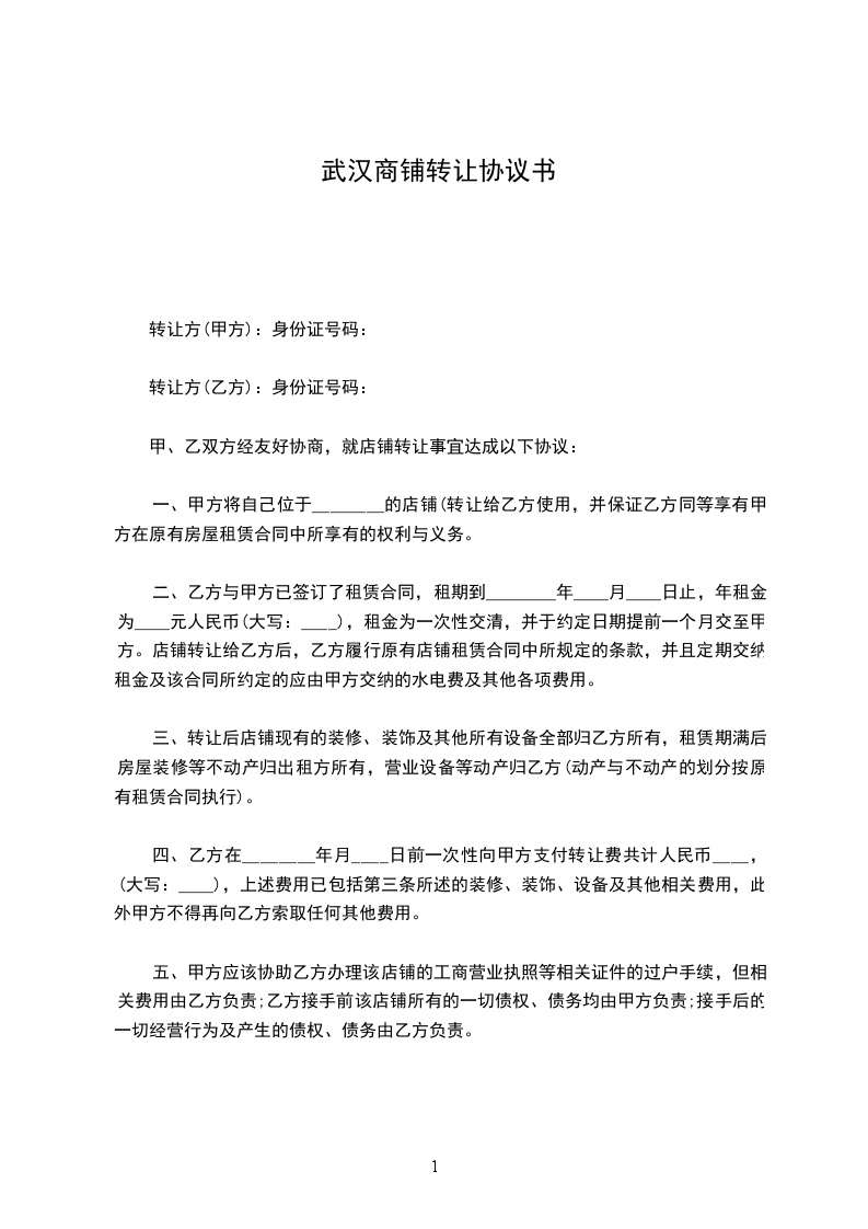 一、甲方将自己位于________的店铺(转让给乙方使用,并保证乙方同等享有甲方在原有房屋租赁合同中所享有的权利与义务。