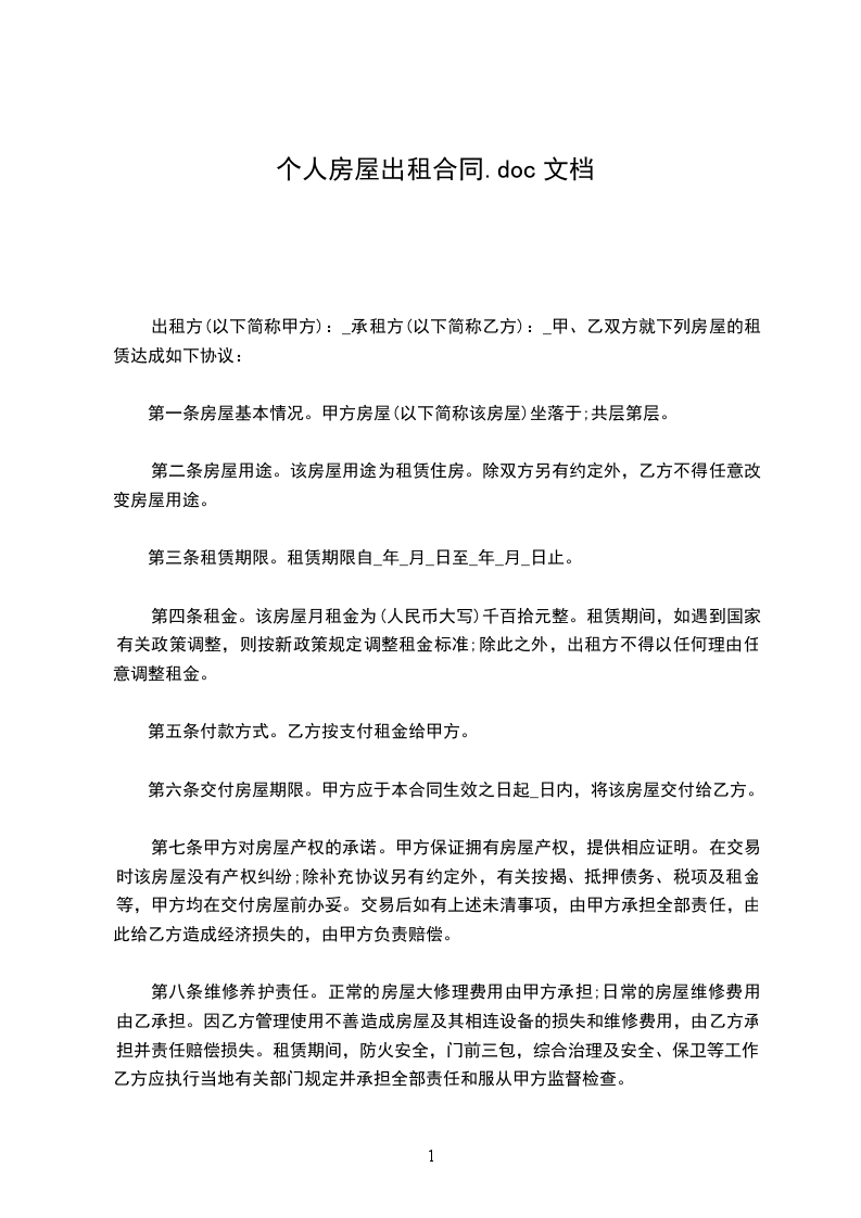 出租方(以下简称甲方):_承租方(以下简称乙方):_甲、乙双方就下列房屋的租赁达成如下协议: